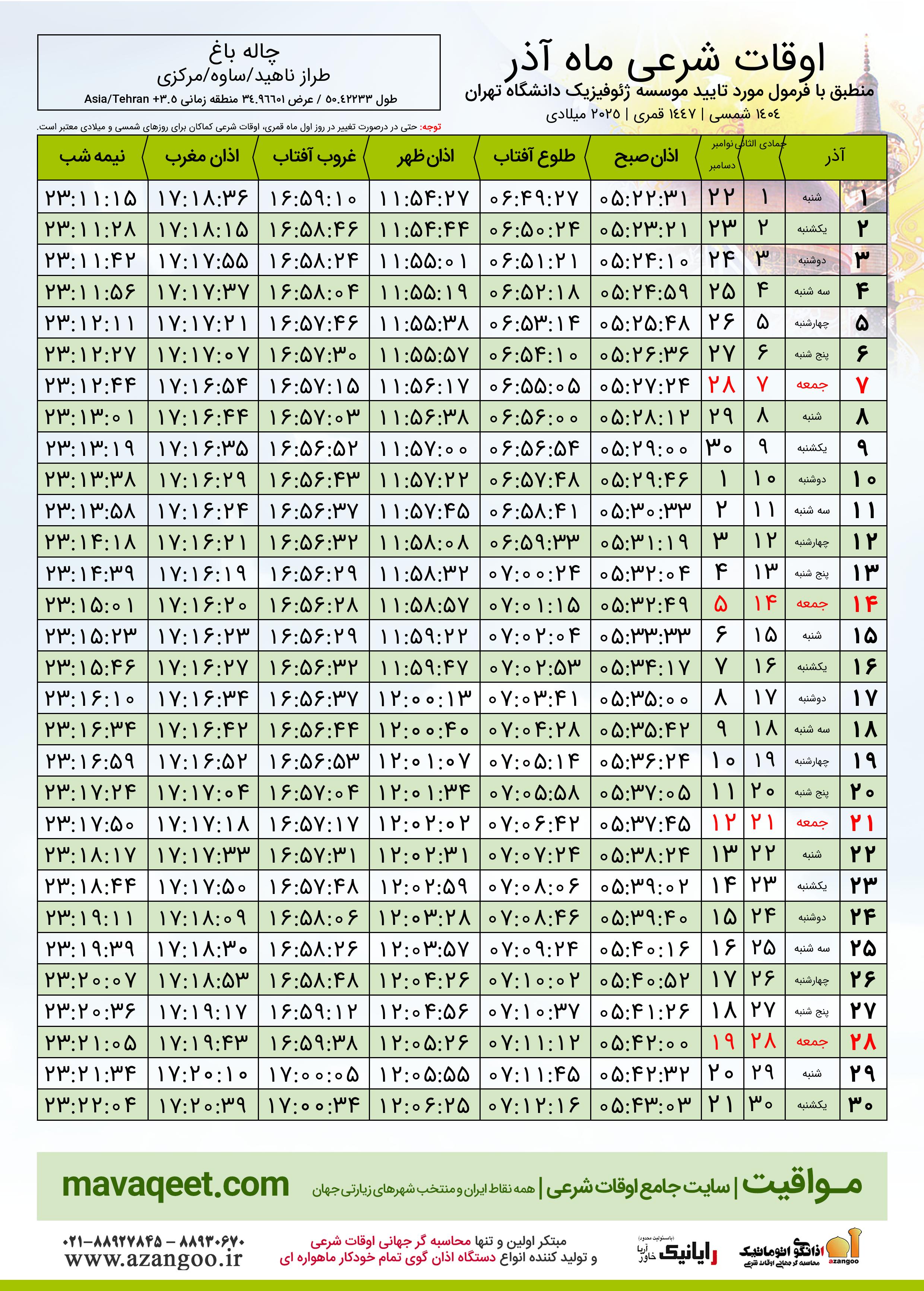 جدول اوقات شرعی آذر ١٤٠٤ شمسی روستای چاله باغ
