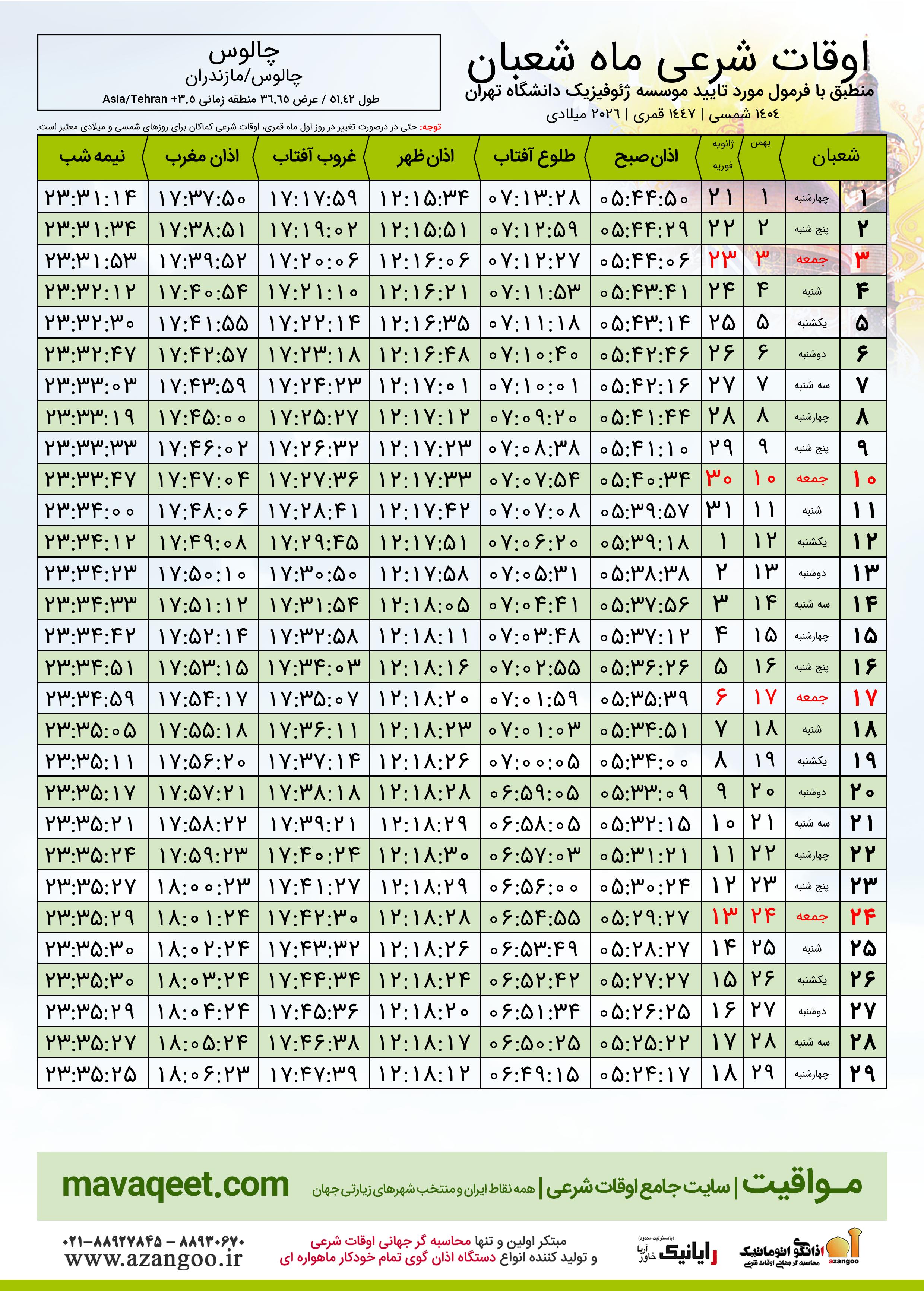 اوقات شرعی ماه شعبان ١٤٤٧ هـ.ق شهر چالوس بر