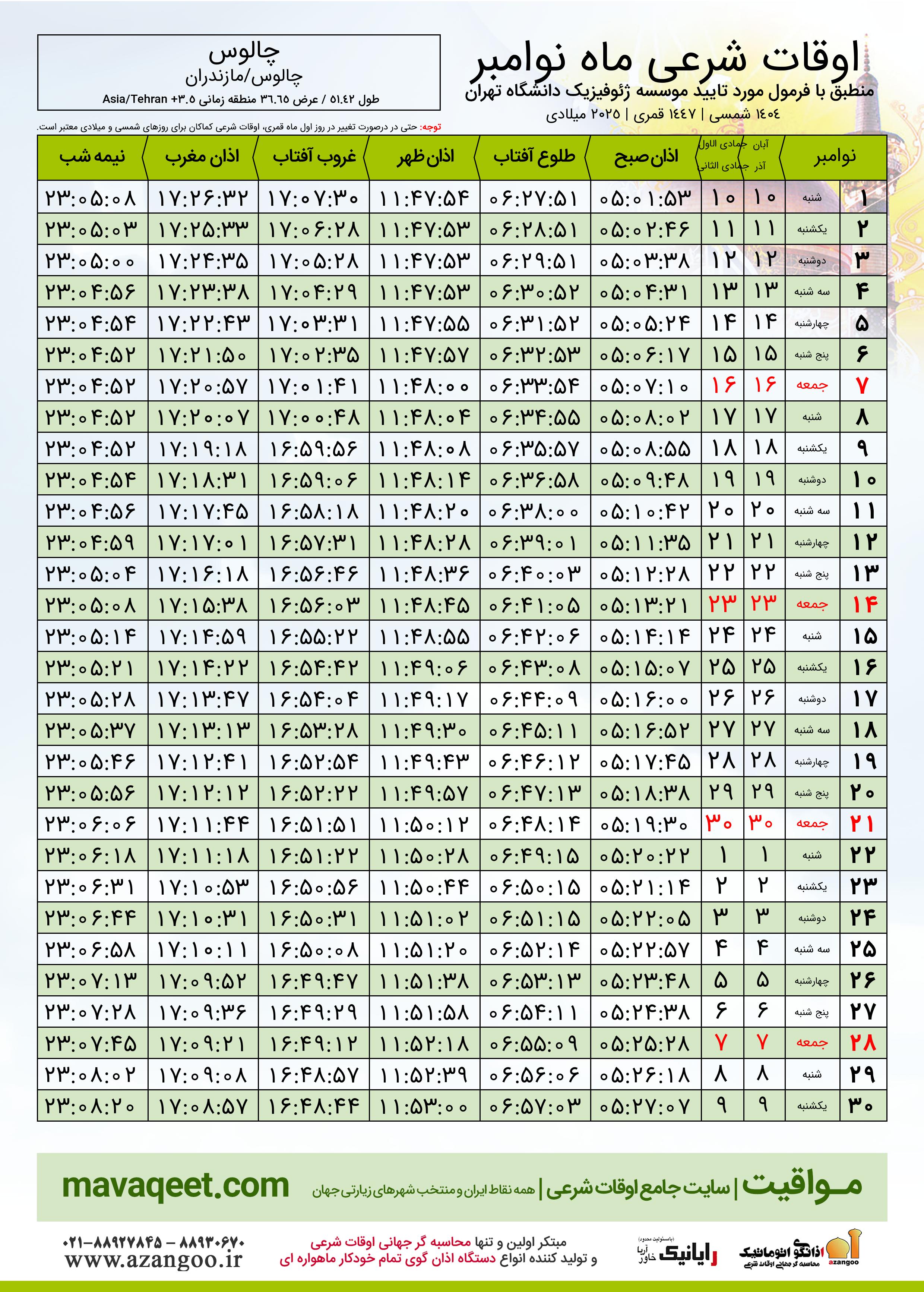 جدول اوقات شرعی نوامبر ٢٠٢٥ میلادی شهر چالوس
