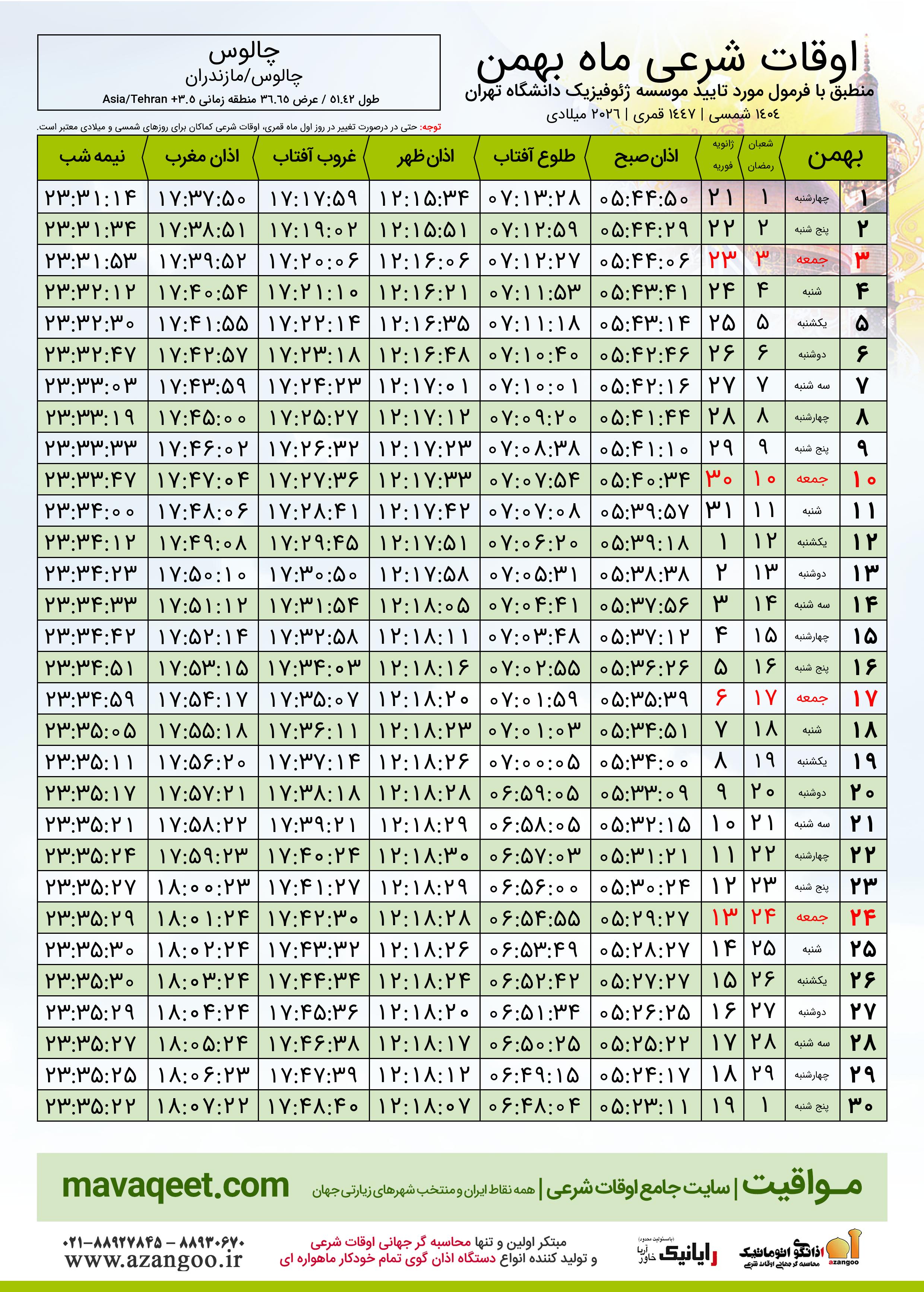 دانلود اوقات شرعی بهمن ٠٤ - ١٤٠٤ شهر چالوس