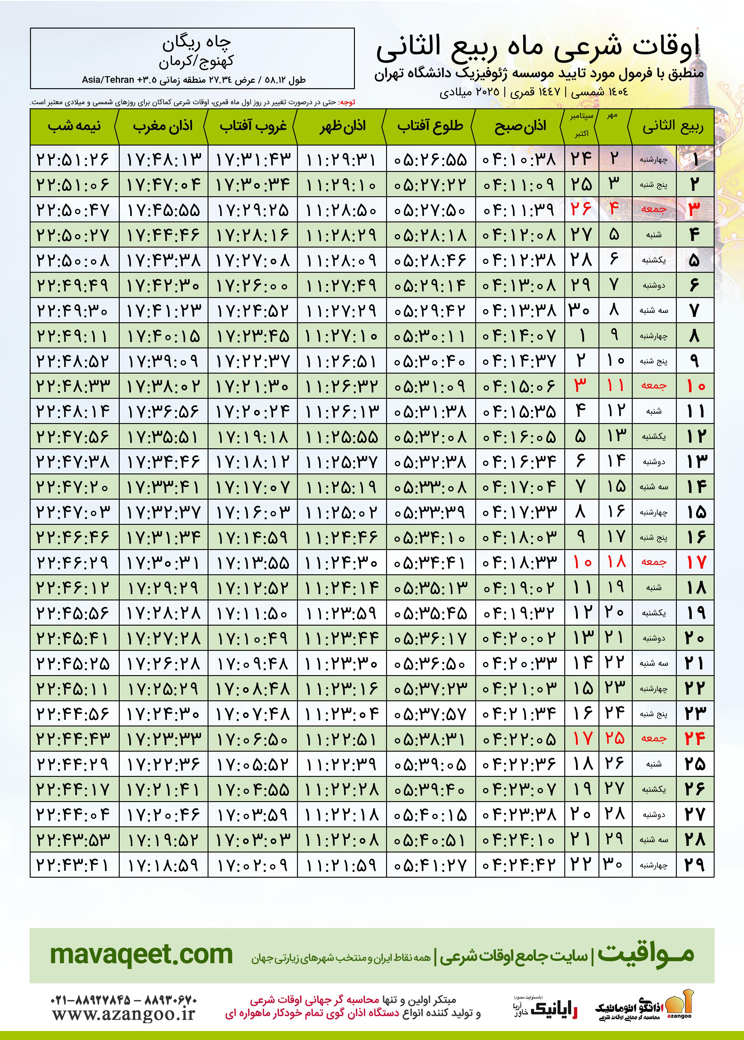 جهت نمایش تصویر جدول اوقات شرعی ماه ربیع الثانی ١٤٤٧ هـ.ق شهر چاه ریگان در اندازه