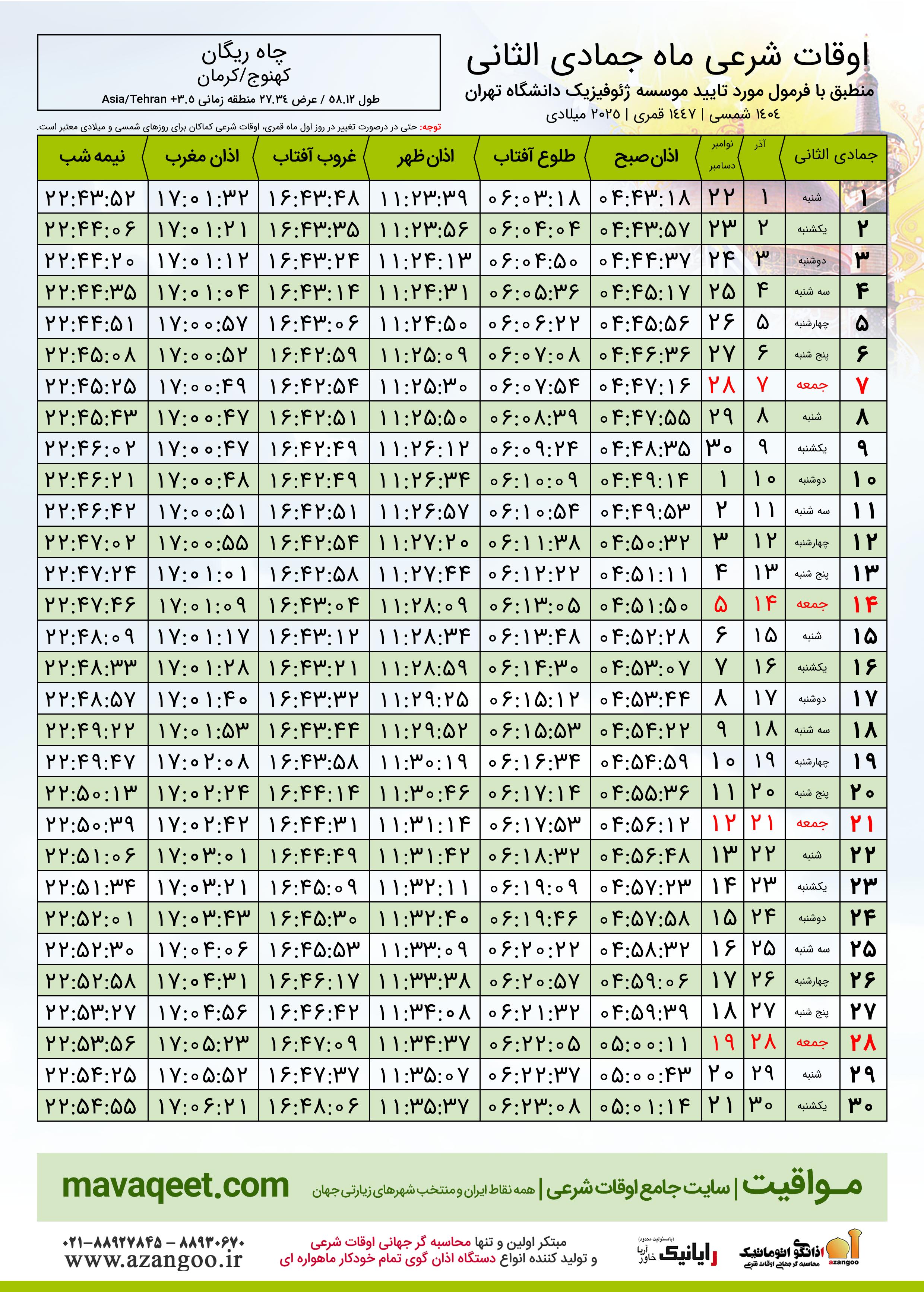 اوقات شرعی ماه جمادی الثانی ١٤٤٧ هـ.ق شهر چاه ریگان بر