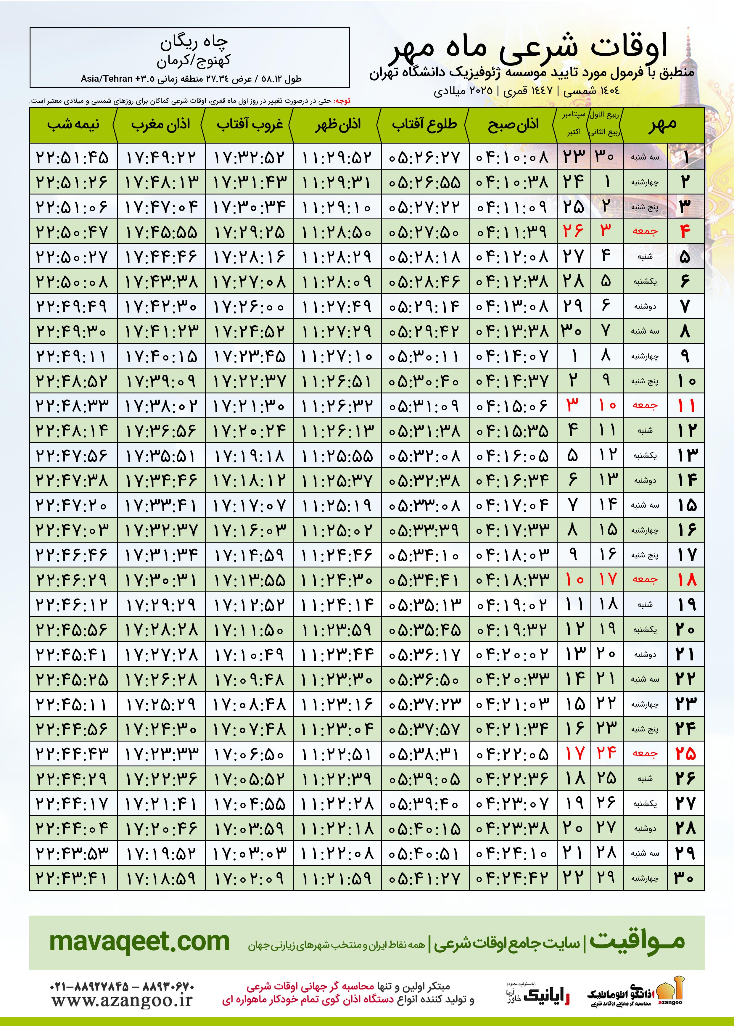 جهت نمایش تصویر جدول اوقات شرعی جدول اوقات شرعی مهر ١٤٠٤ شمسی شهر چاه ریگان شهر چاه ریگان در اندازه