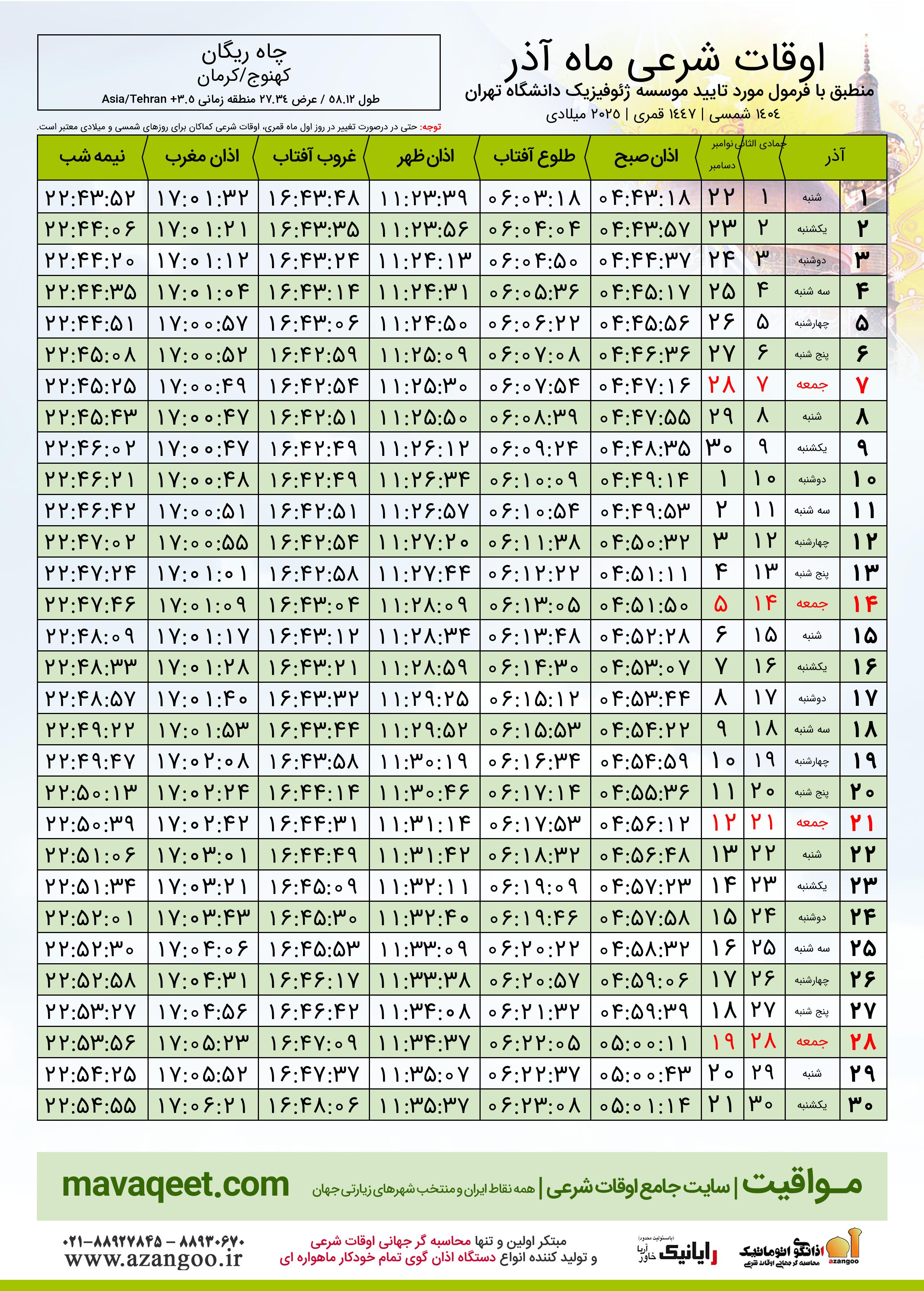 اوقات شرعی آذر ١٤٠٤ شمسی شهر چاه ریگان