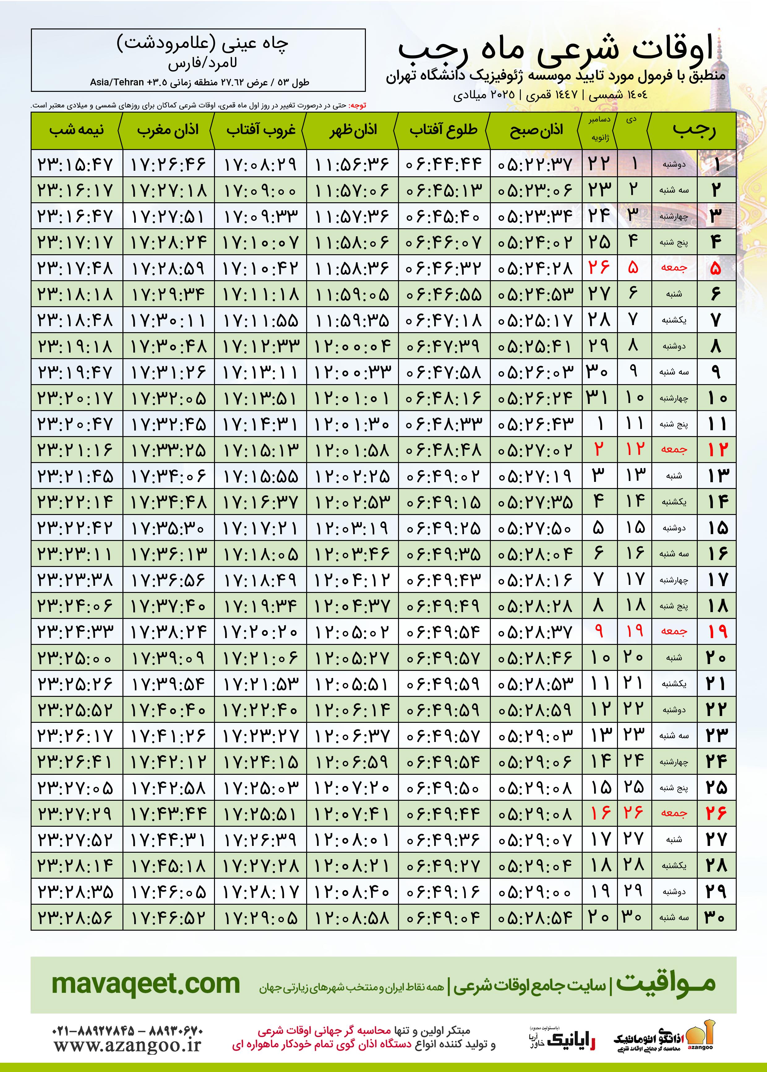 اوقات شرعی ماه رجب ١٤٤٧ هـ.ق شهر چاه عینی (علامرودشت) بر