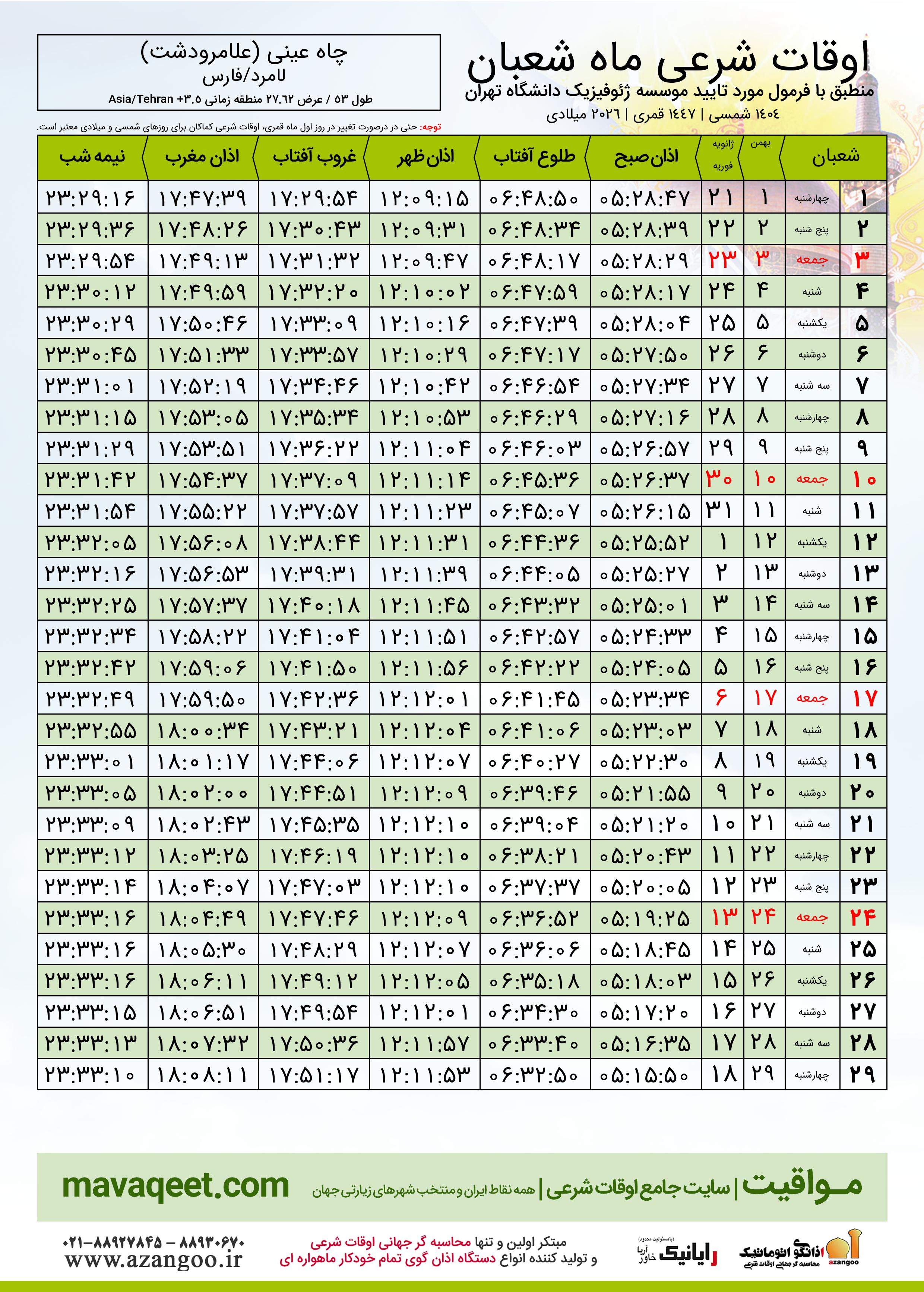 اوقات شرعی ماه شعبان ١٤٤٧ هـ.ق شهر چاه عینی (علامرودشت) بر