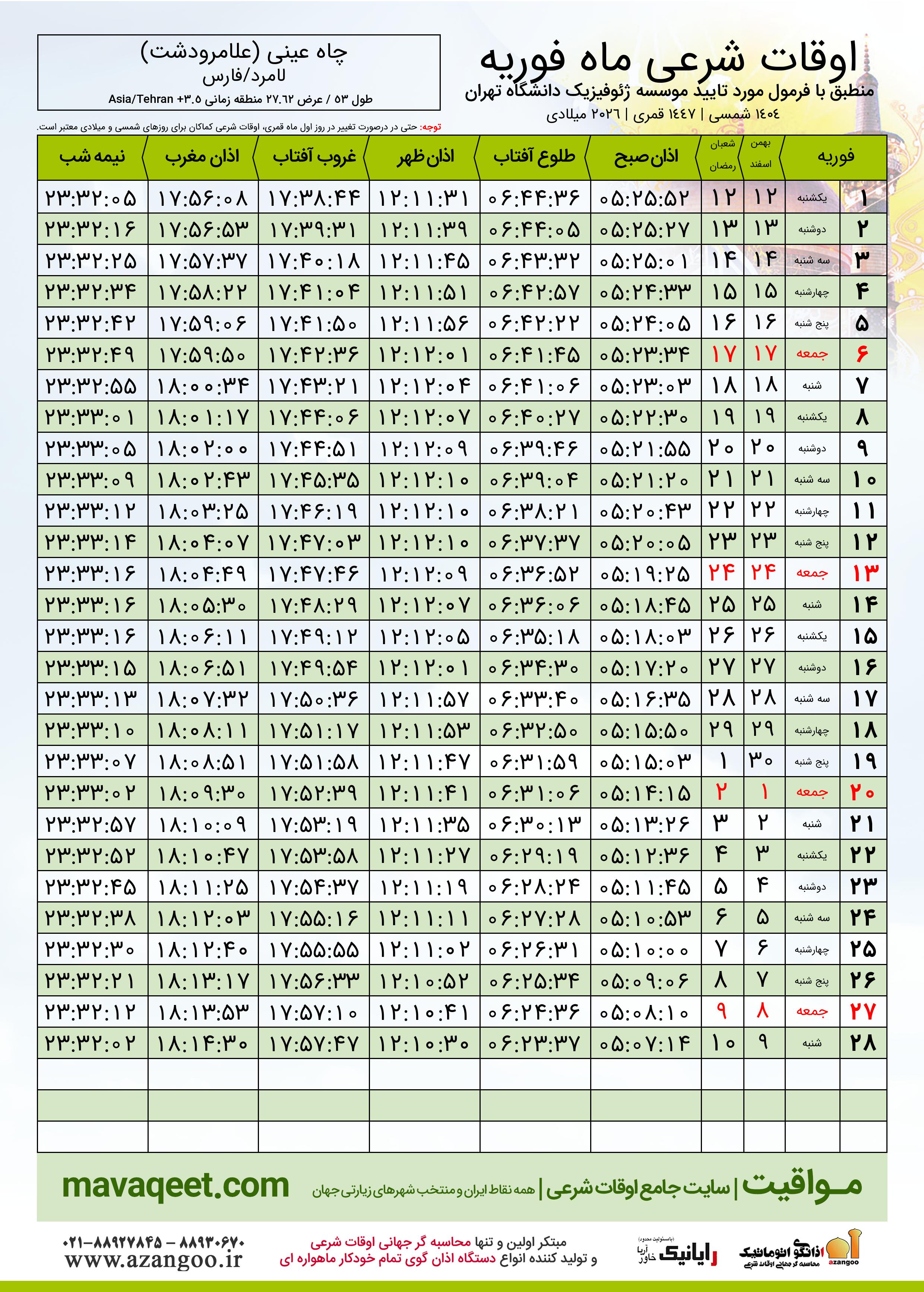 دانلود اوقات شرعی ماه رمضان ٠٤ - ١٤٠٤ شمسی | ٢٠٢٦ میلادی | ١٤٤٧ قمری شهر چاه عینی (علامرودشت)