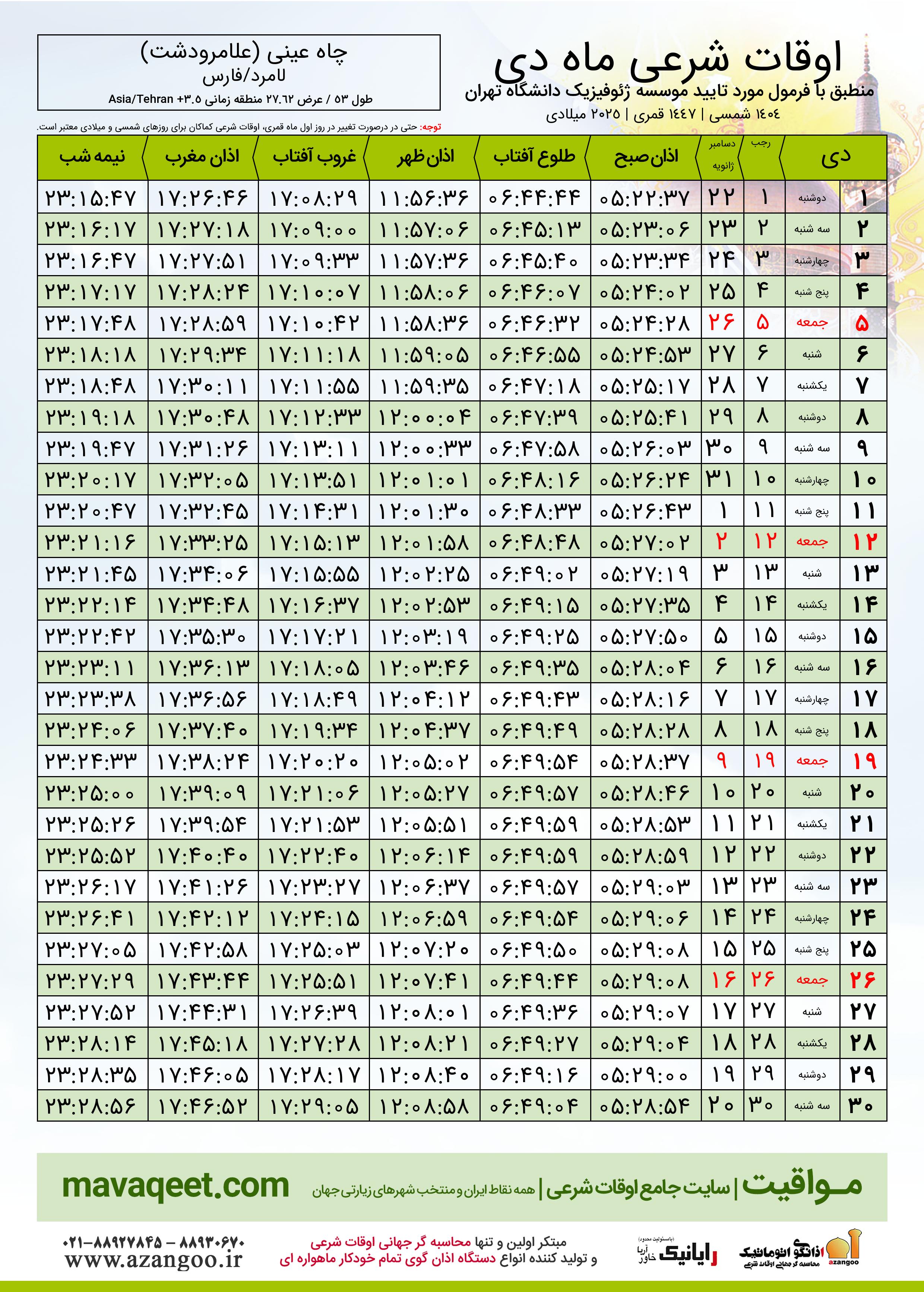 جدول اوقات شرعی دی ١٤٠٤ شمسی شهر چاه عینی (علامرودشت)