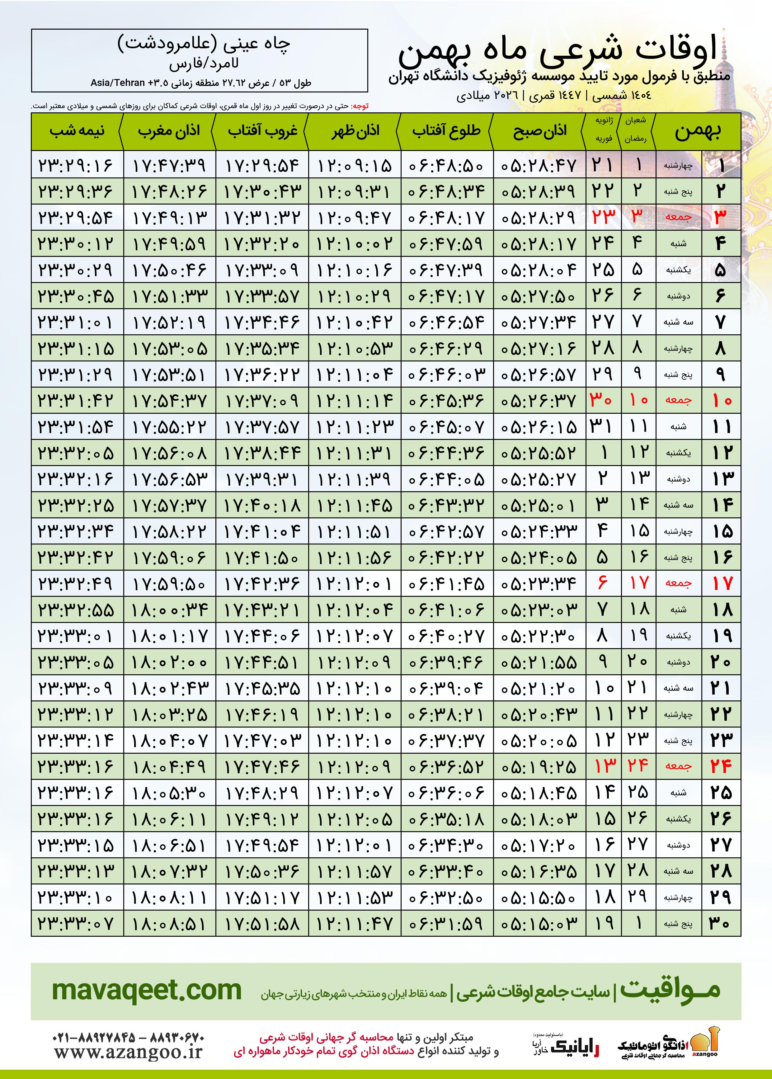 دانلود اوقات شرعی بهمن ٠٤ - ١٤٠٤ شهر چاه عینی (علامرودشت)