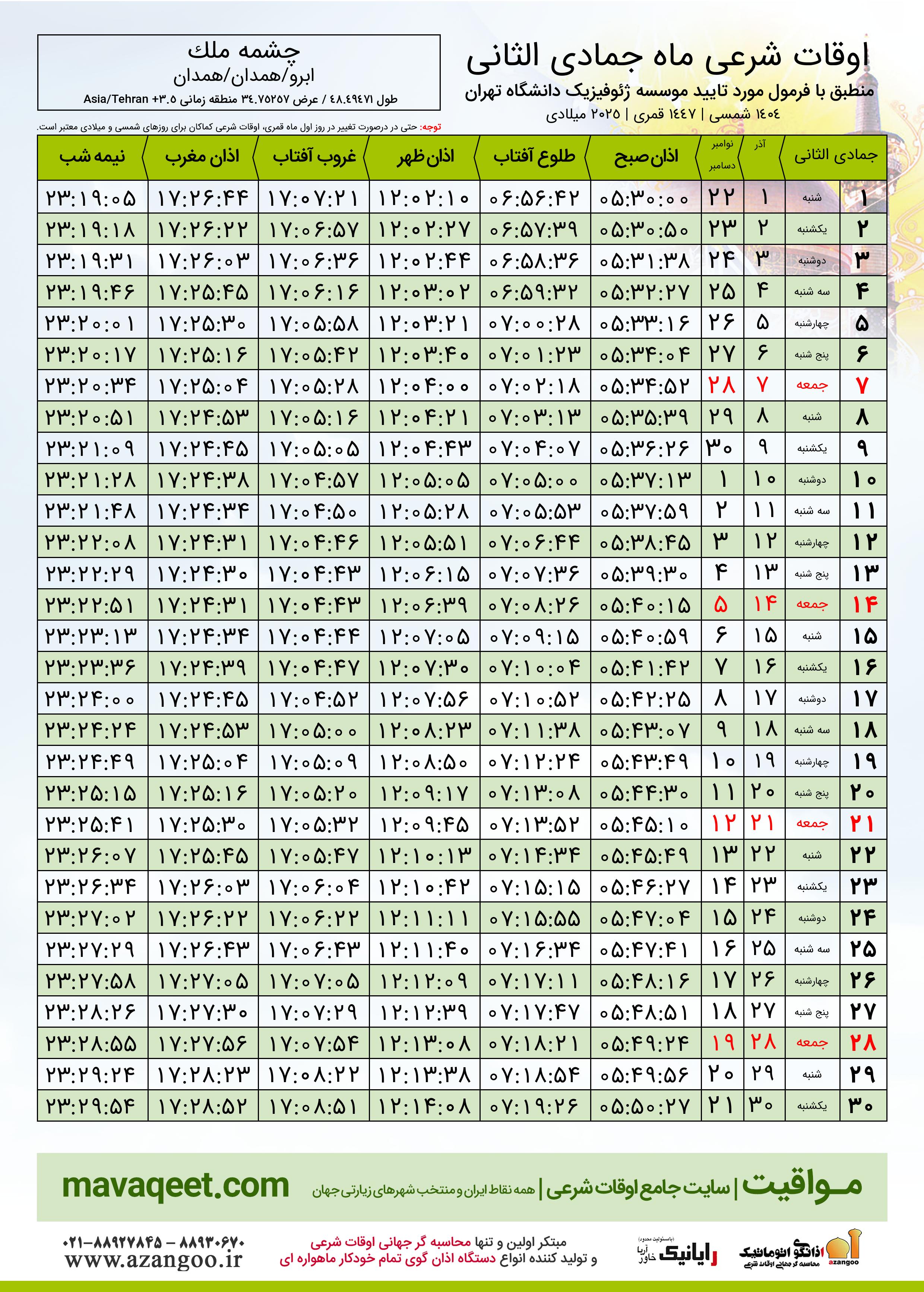 جدول اوقات شرعی جمادی الثانی ١٤٤٧ قمری روستای چشمه ملک