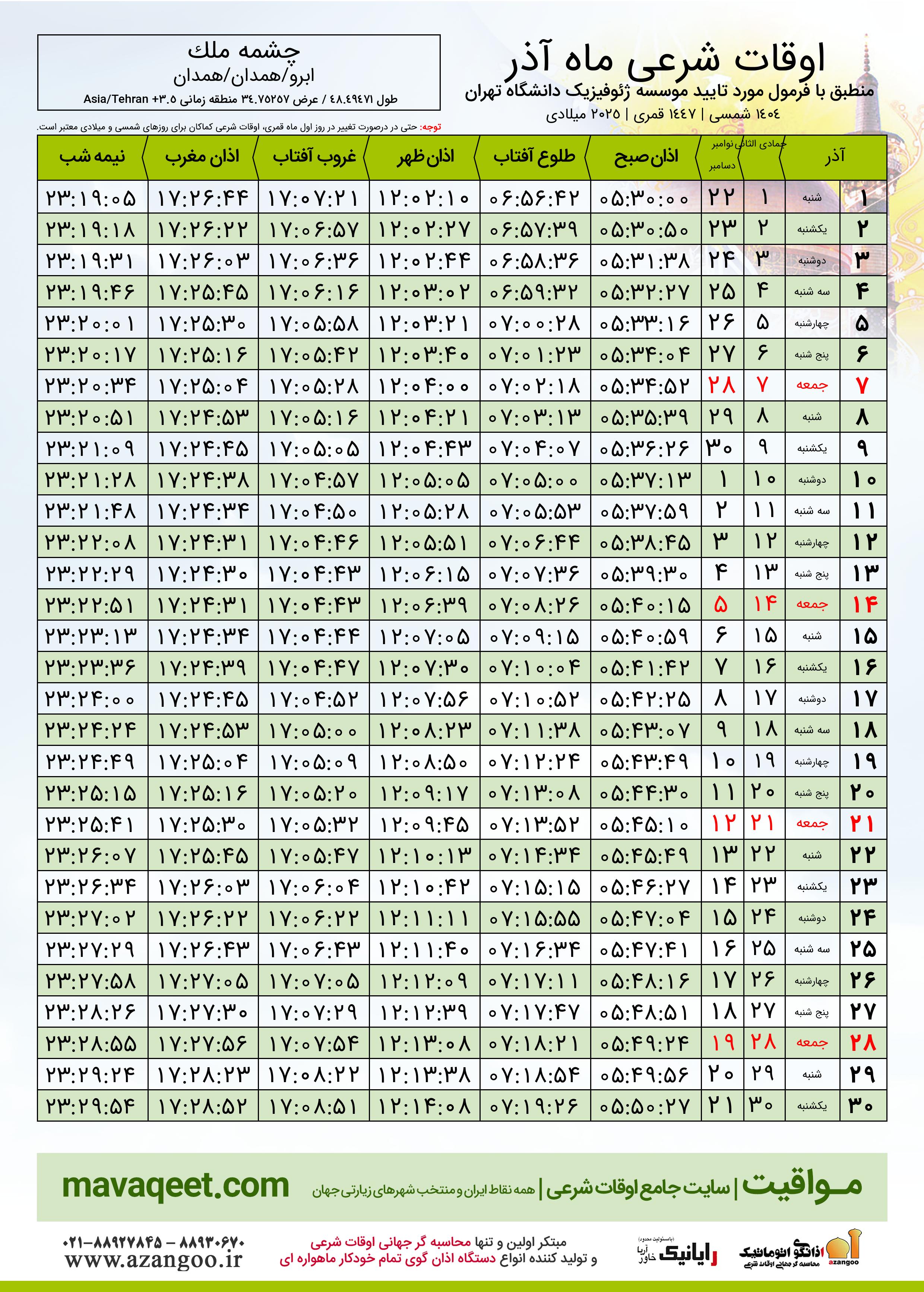 جدول اوقات شرعی آذر ١٤٠٤ شمسی روستای چشمه ملک