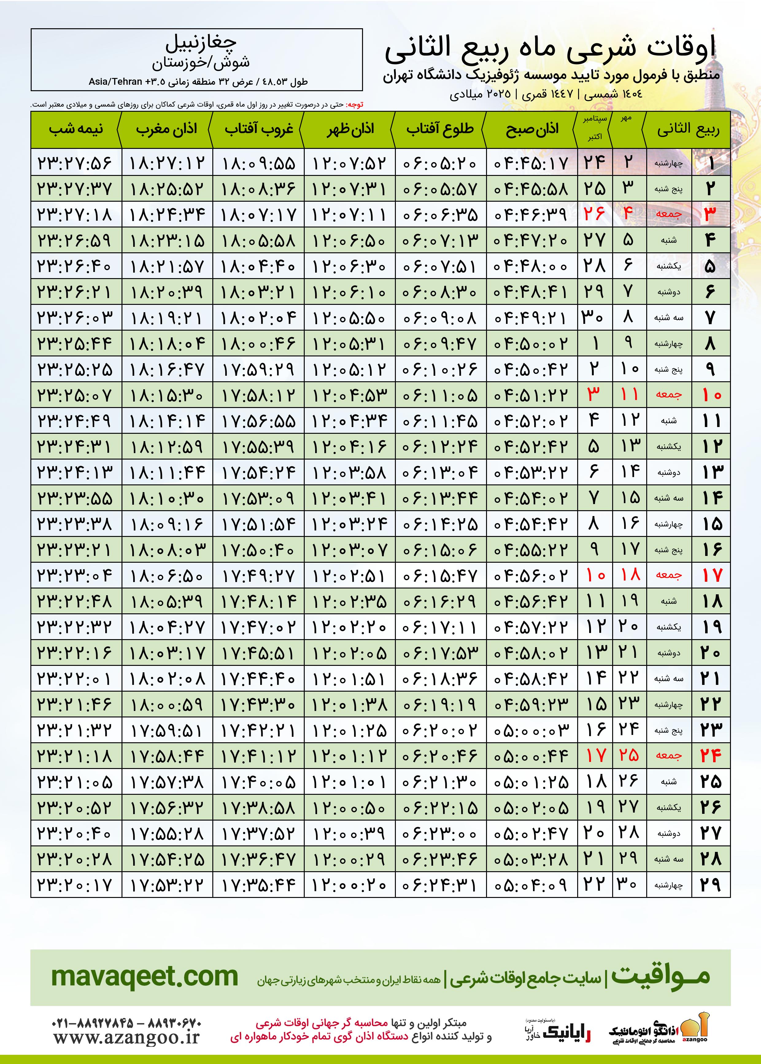 اوقات شرعی ماه ربیع الثانی ١٤٤٧ هـ.ق شهر چغازنبیل بر