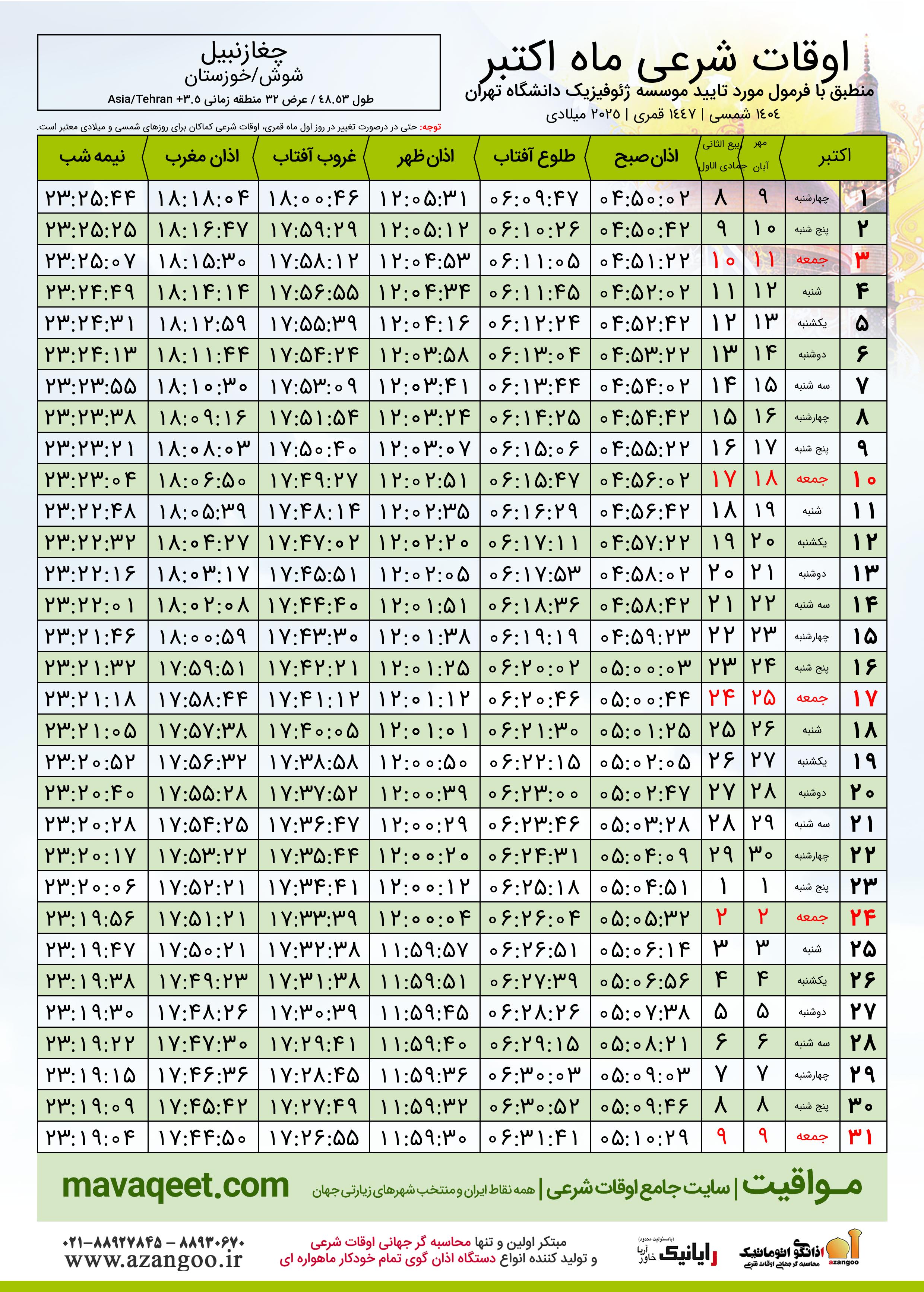 جدول اوقات شرعی اکتبر ٢٠٢٥ میلادی شهر چغازنبیل