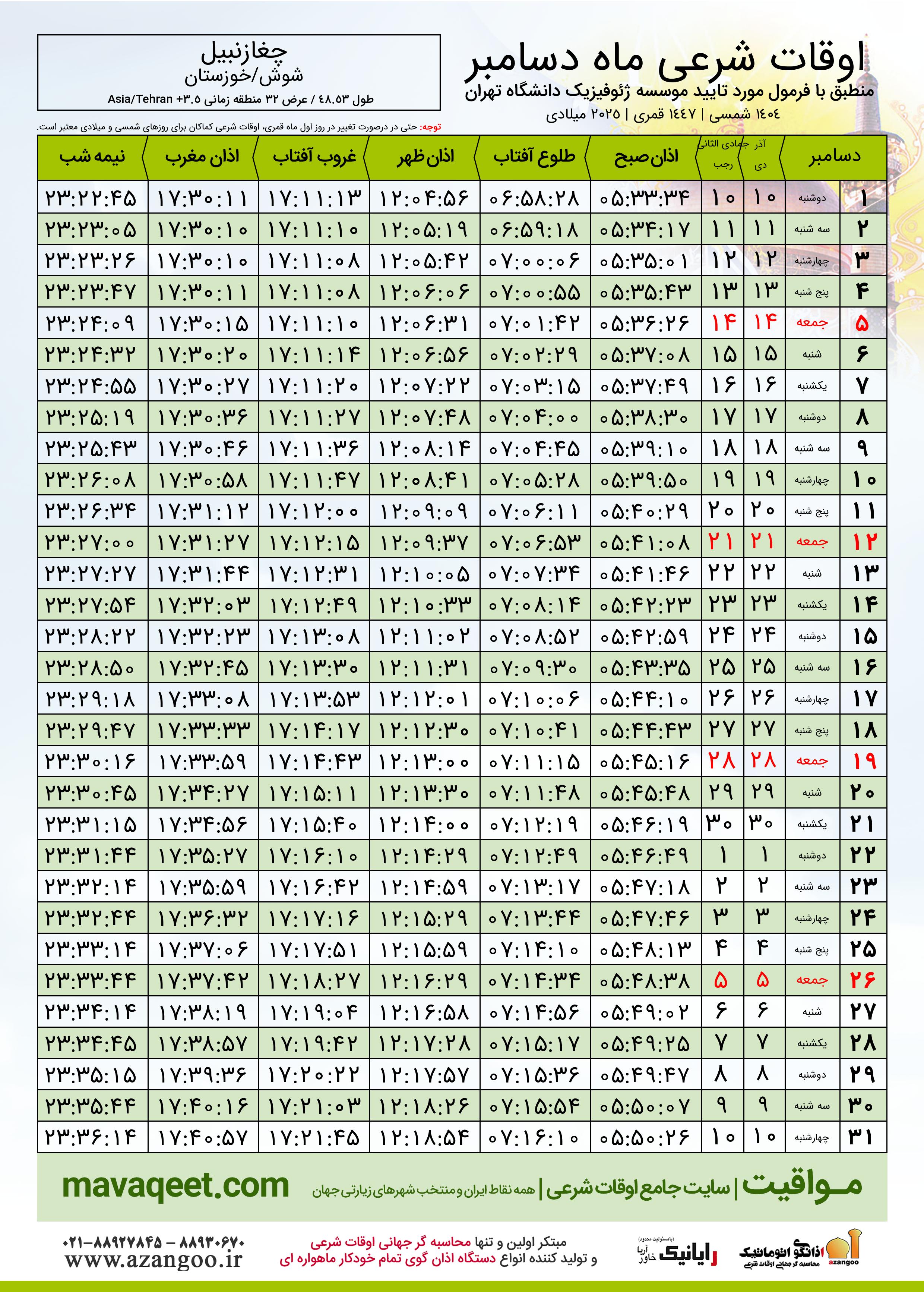 جدول اوقات شرعی دسامبر ٢٠٢٥ میلادی شهر چغازنبیل