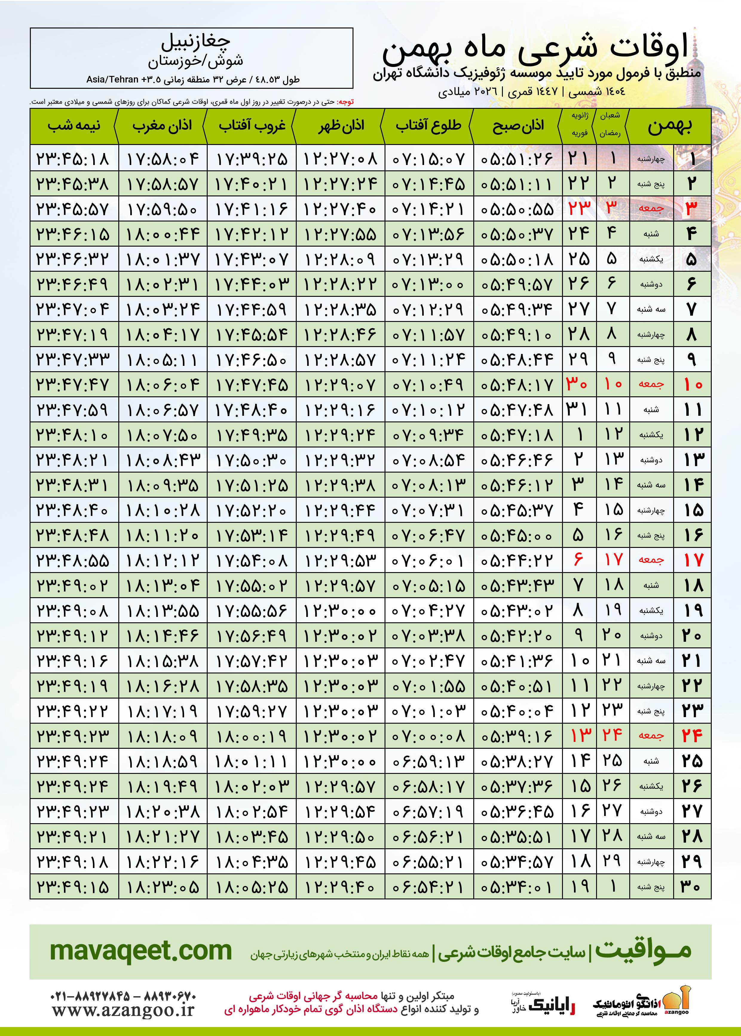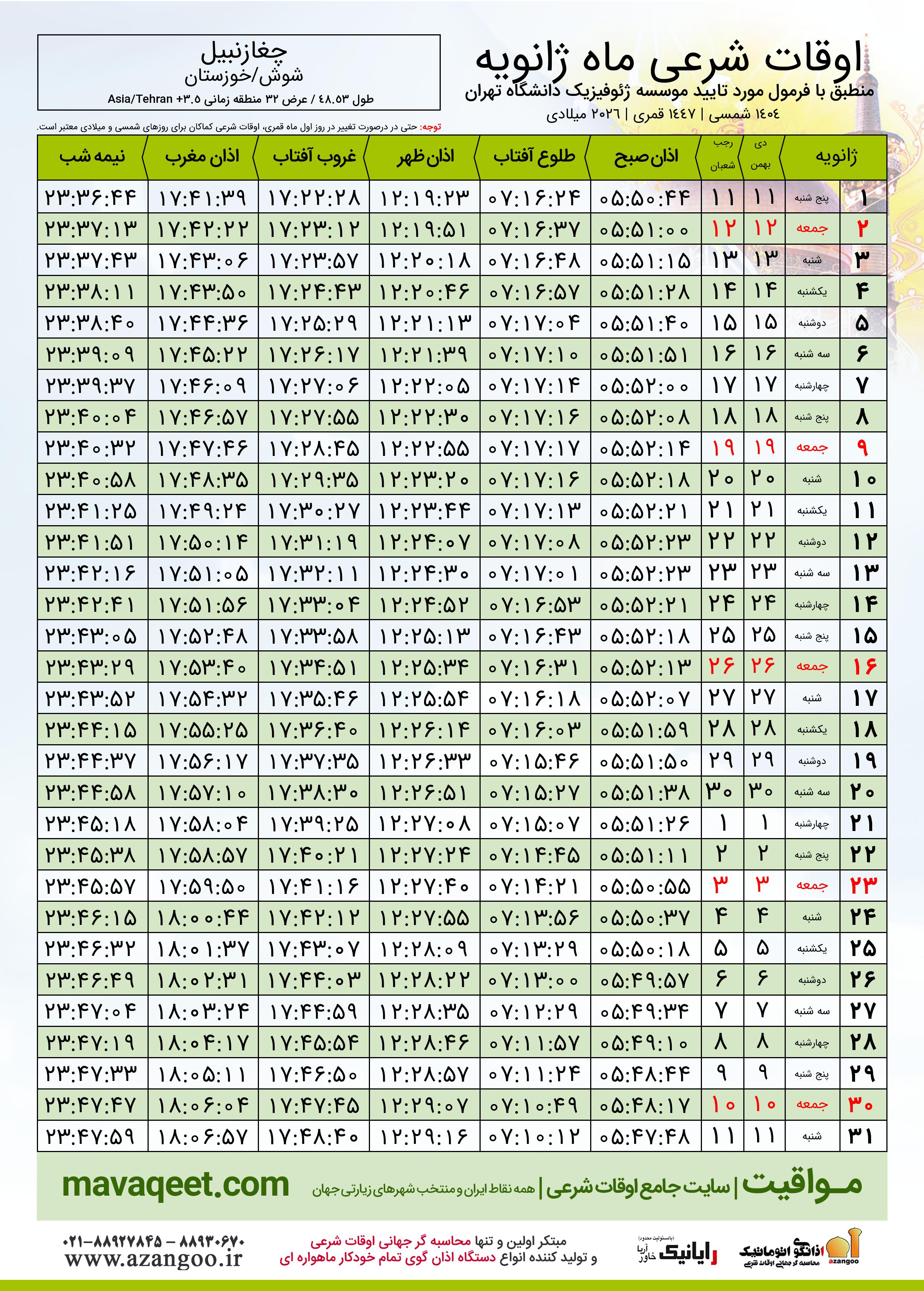 اوقات شرعی ژانویه ٢٠٢٦ شهر چغازنبیل + دانلود