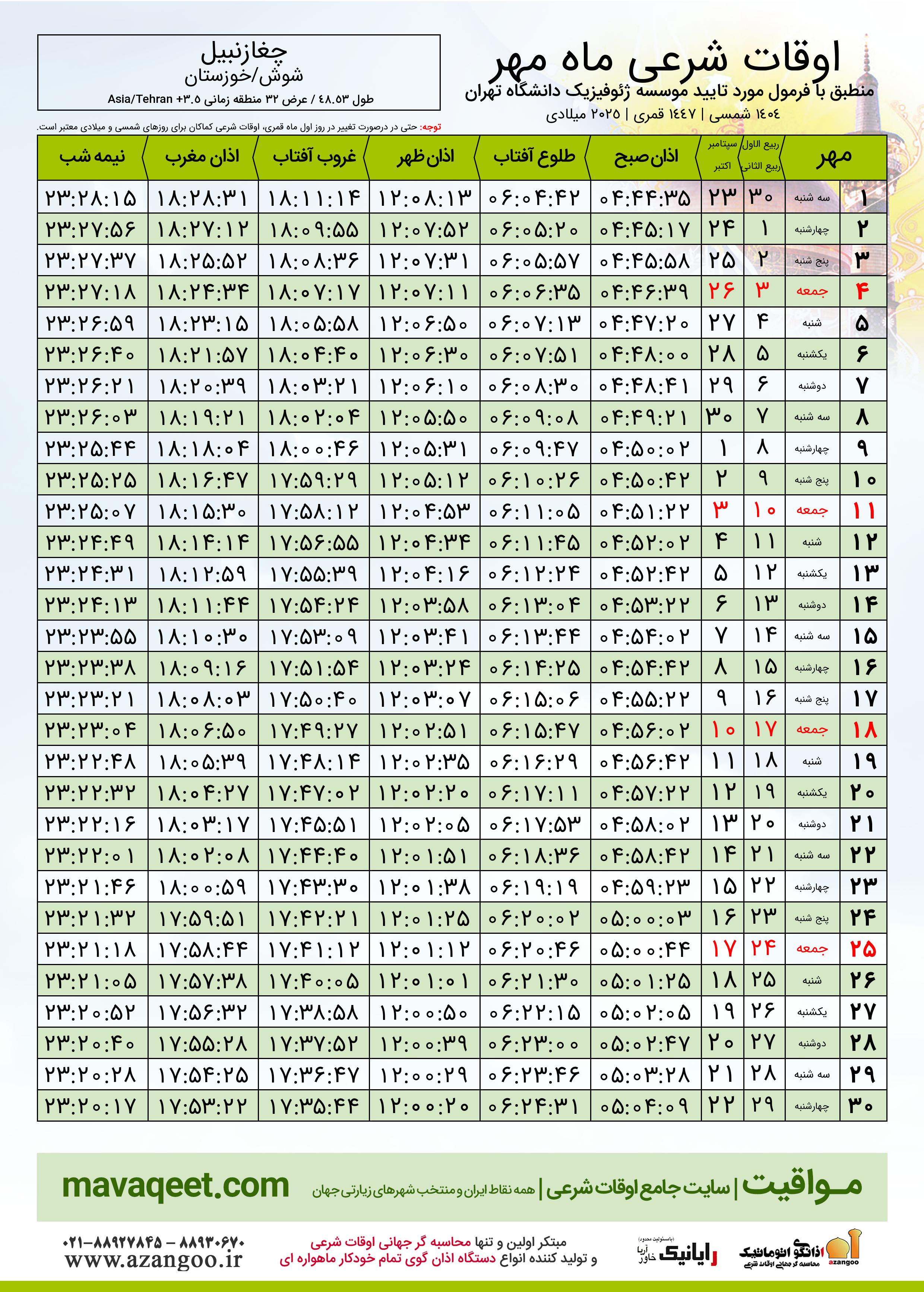 اوقات شرعی مهر ١٤٠٤ شمسی شهر چغازنبیل