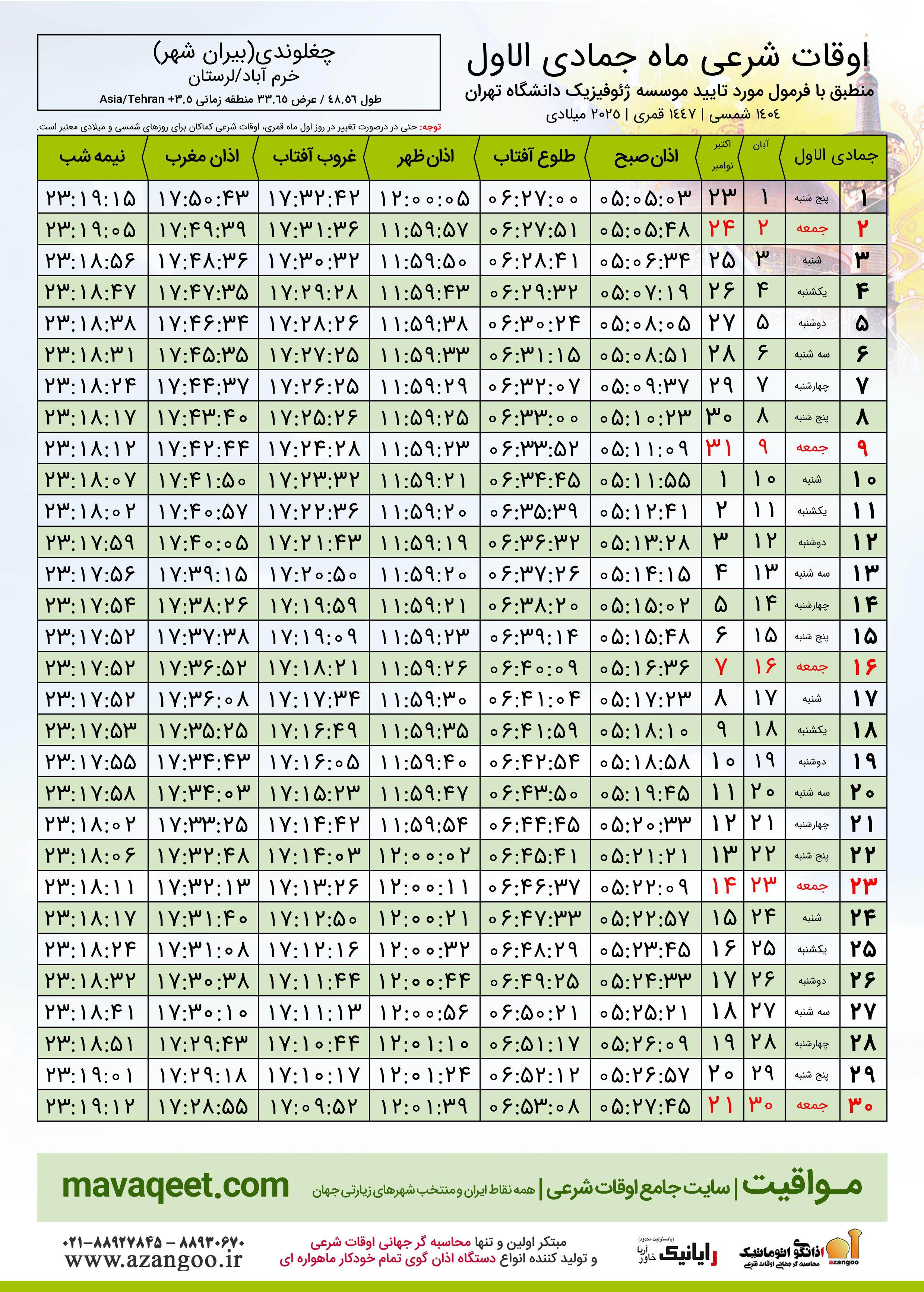 جدول اوقات شرعی جمادی الاول ١٤٤٧ قمری شهر چغلوندی(بیران شهر)