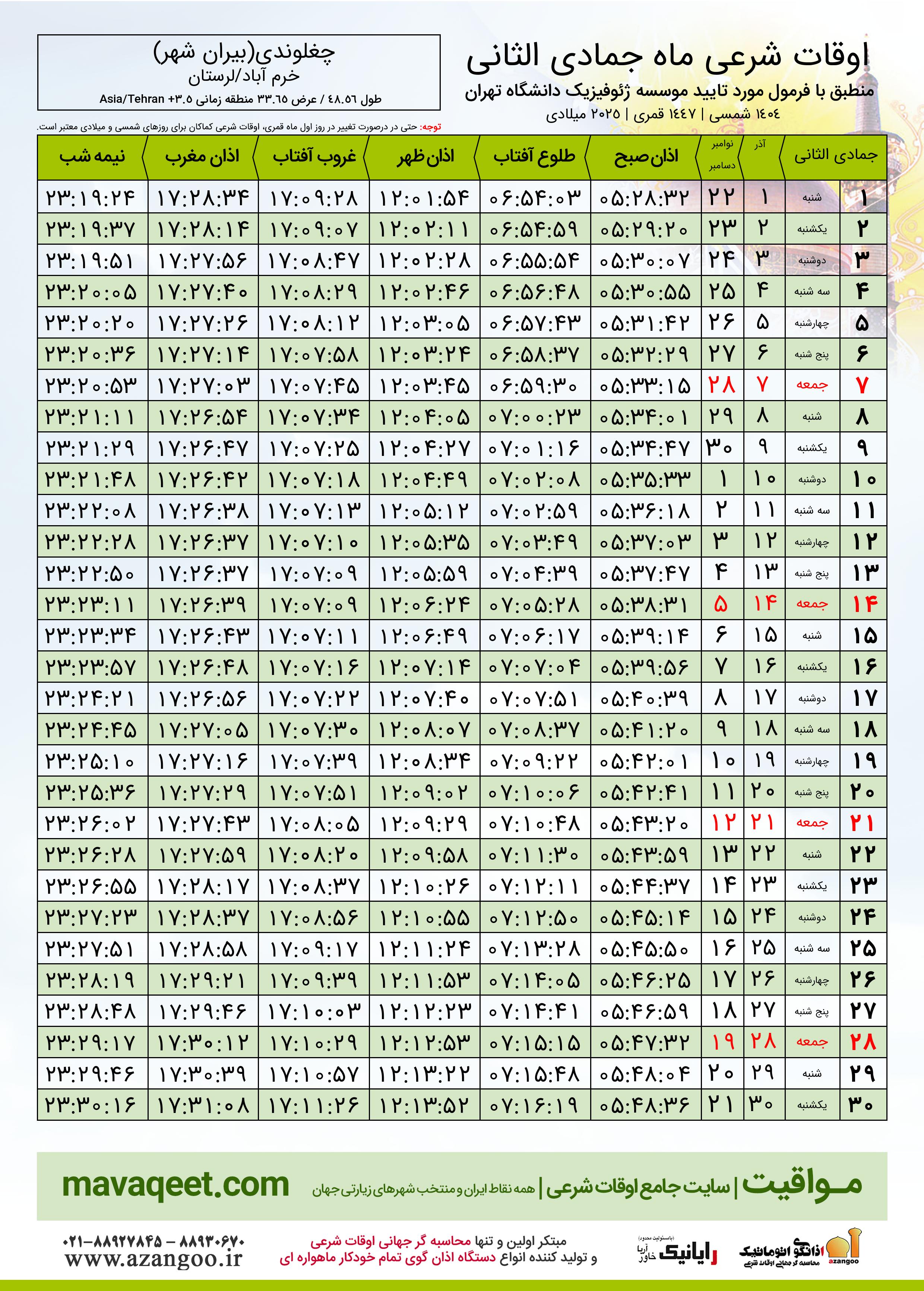 جدول اوقات شرعی جمادی الثانی ١٤٤٧ قمری شهر چغلوندی(بیران شهر)