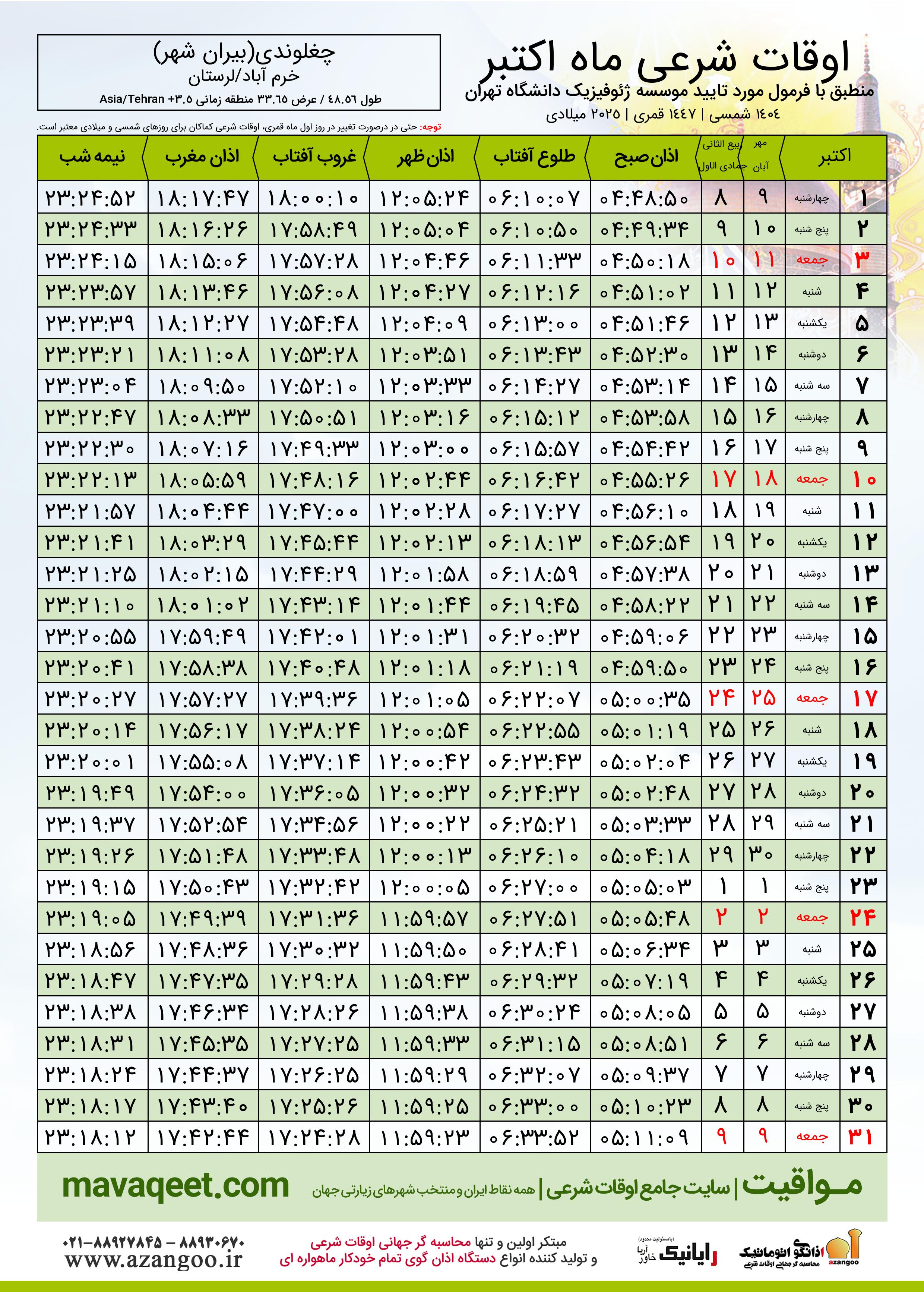 جدول اوقات شرعی اکتبر ٢٠٢٥ میلادی شهر چغلوندی(بیران شهر)