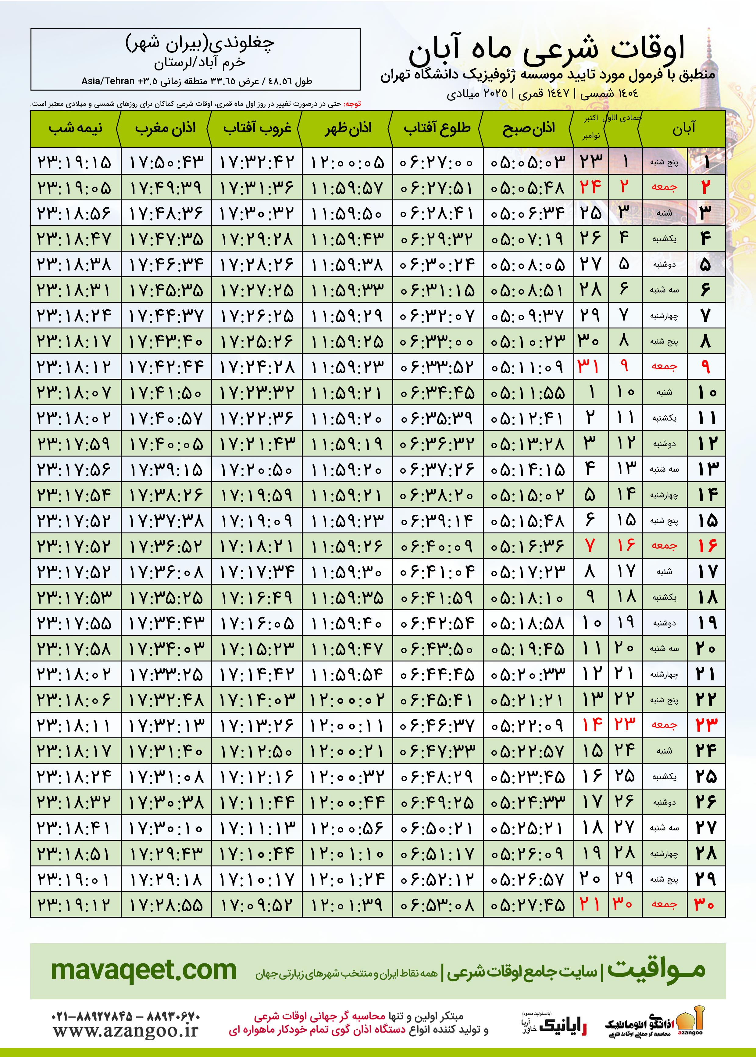 جدول اوقات شرعی آبان ١٤٠٤ شمسی شهر چغلوندی(بیران شهر)
