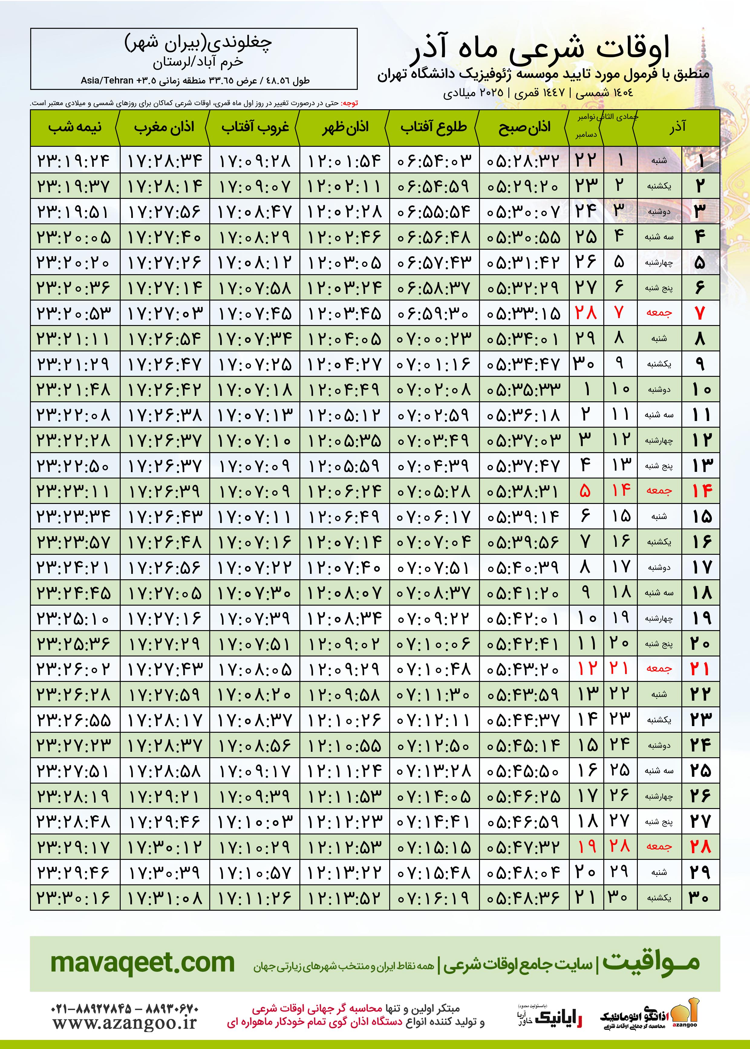 جدول اوقات شرعی آذر ١٤٠٤ شمسی شهر چغلوندی(بیران شهر)
