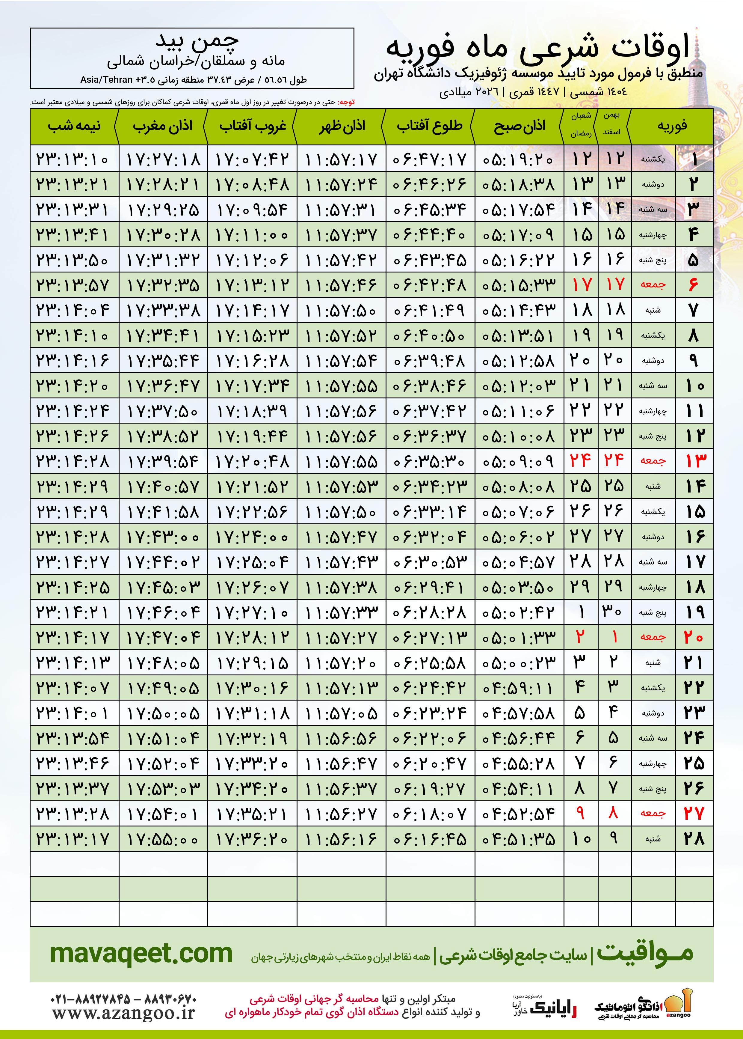 اوقات شرعی ماه شعبان ١٤٤٧ هـ.ق شهر چمن بید بر