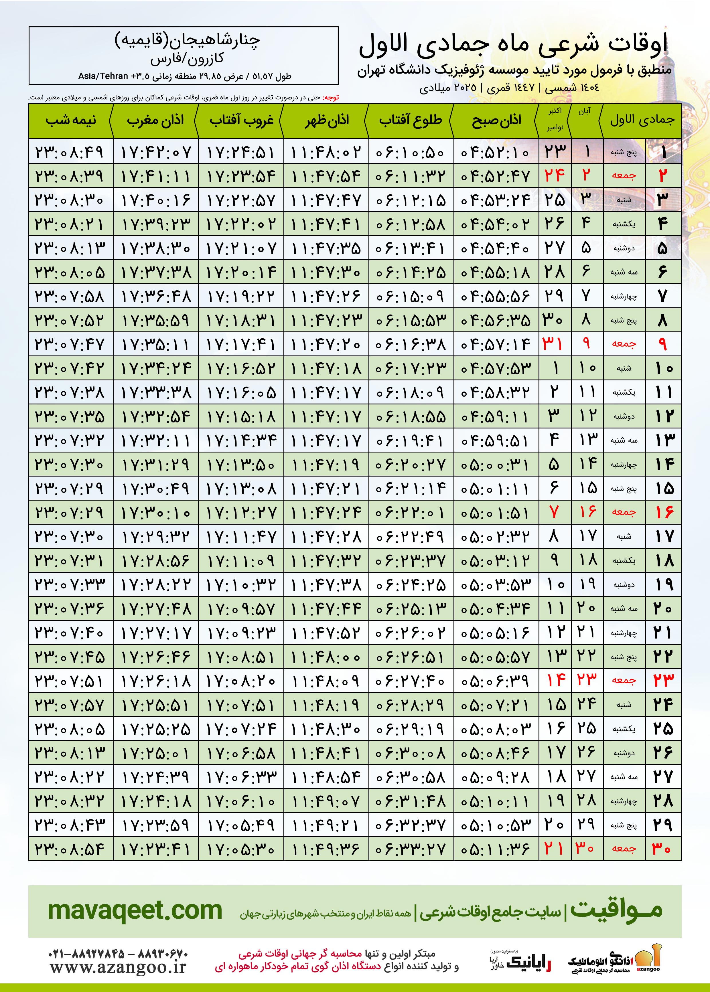 جدول اوقات شرعی جمادی الاول ١٤٤٧ قمری شهر چنارشاهیجان(قایمیه)