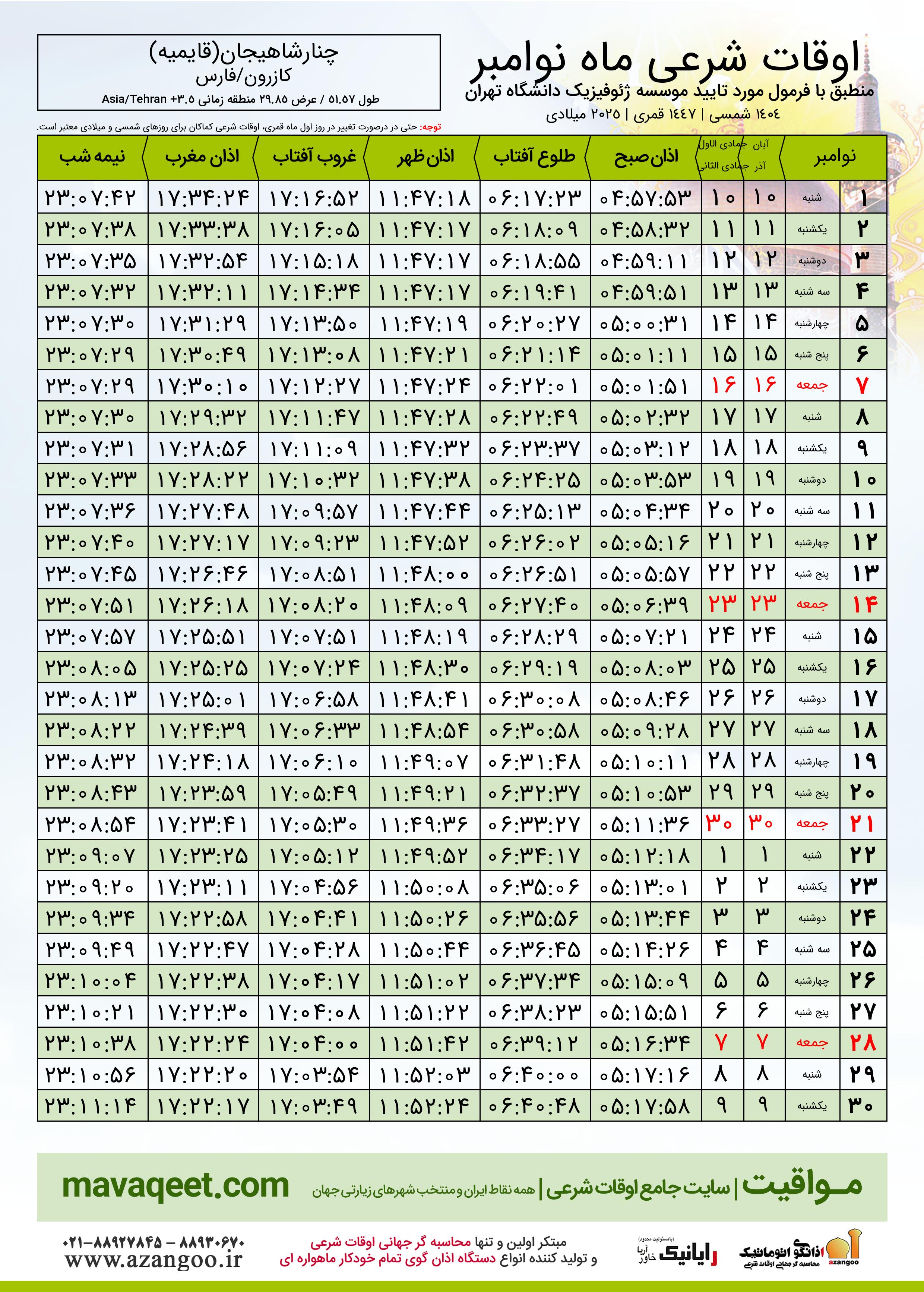 اوقات شرعی نوامبر ٢٠٢٥ میلادی شهر چنارشاهیجان(قایمیه)