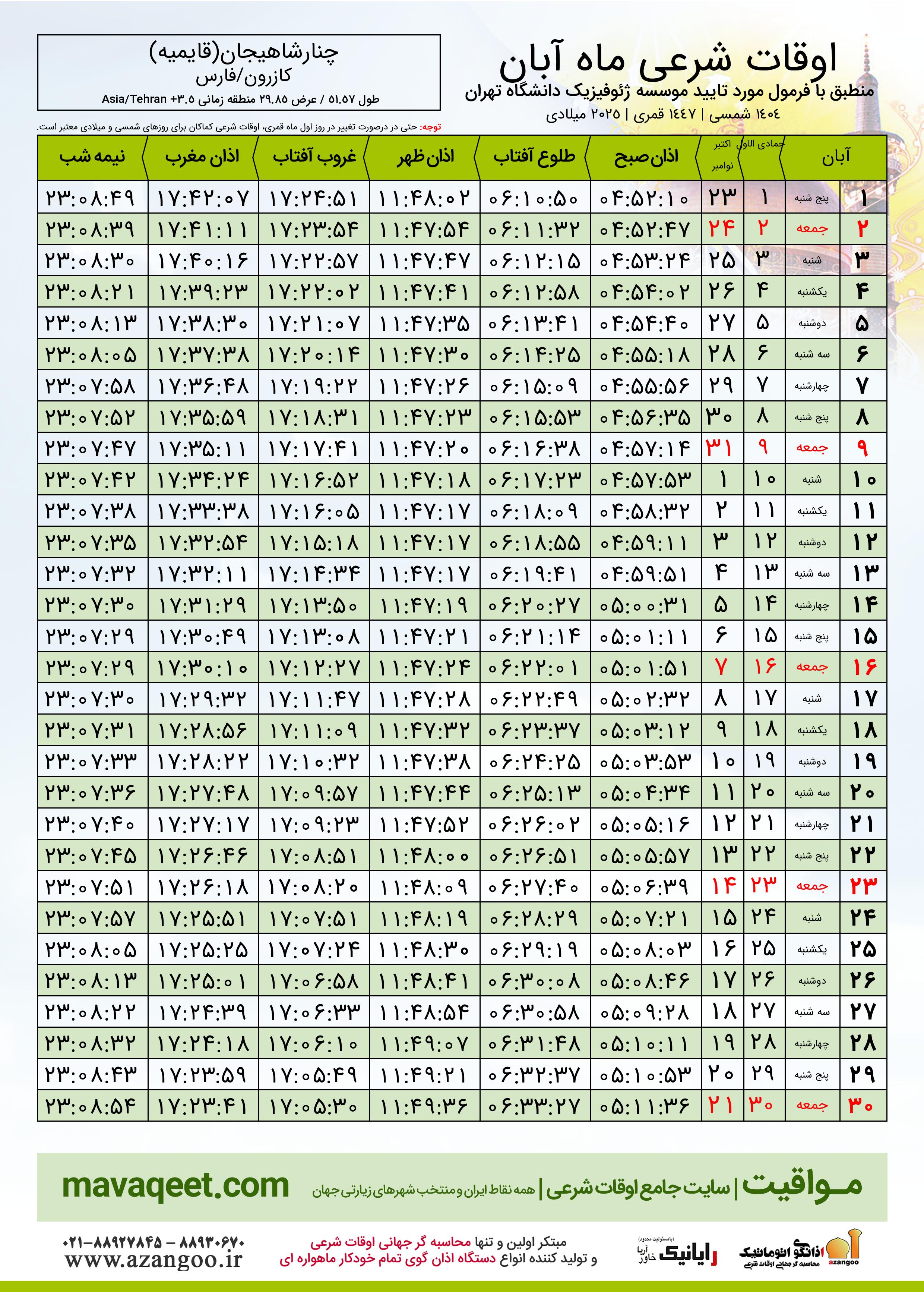 جدول اوقات شرعی آبان ١٤٠٤ شمسی شهر چنارشاهیجان(قایمیه)