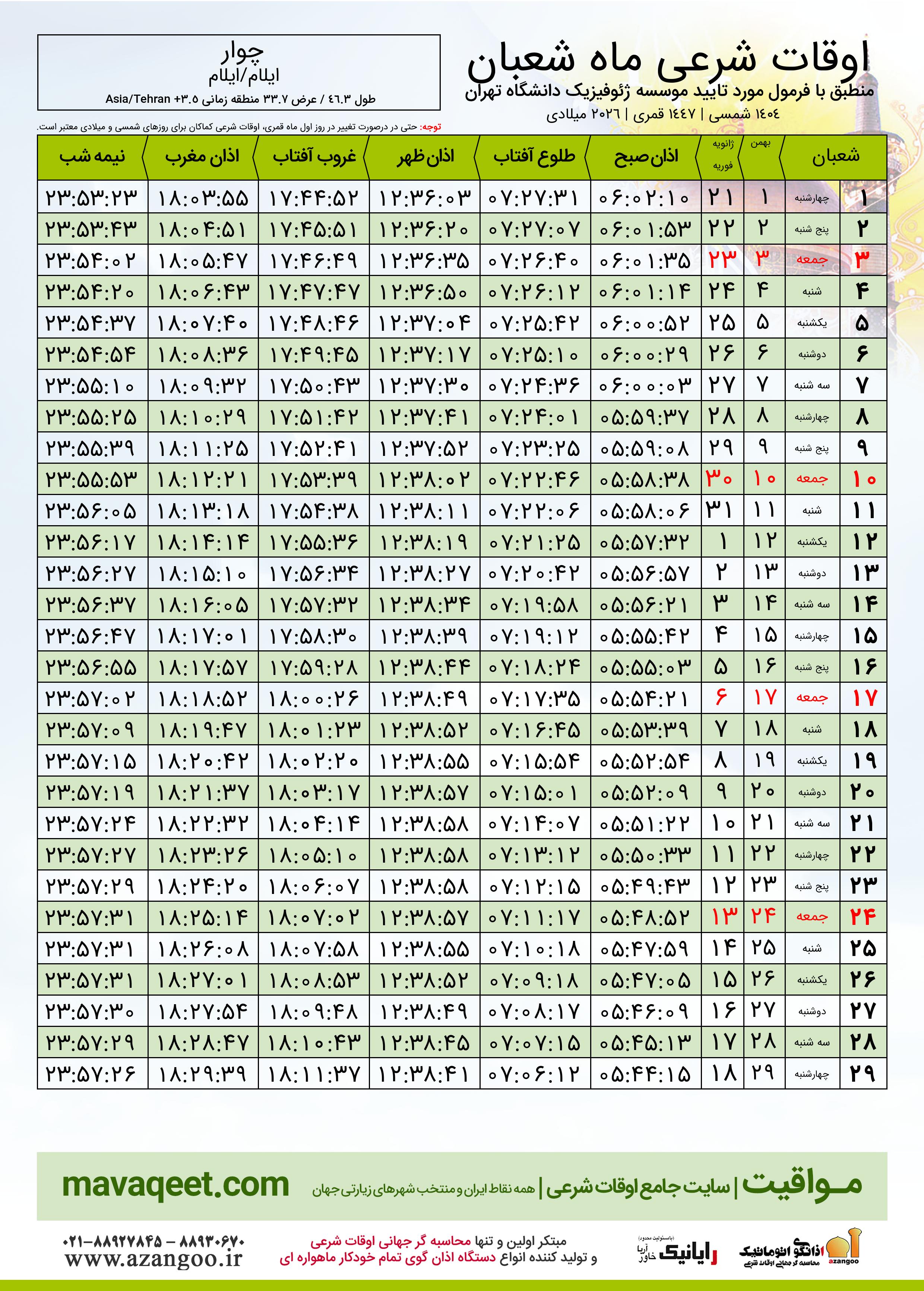 جدول اوقات شرعی شعبان ١٤٤٧ قمری شهر چوار