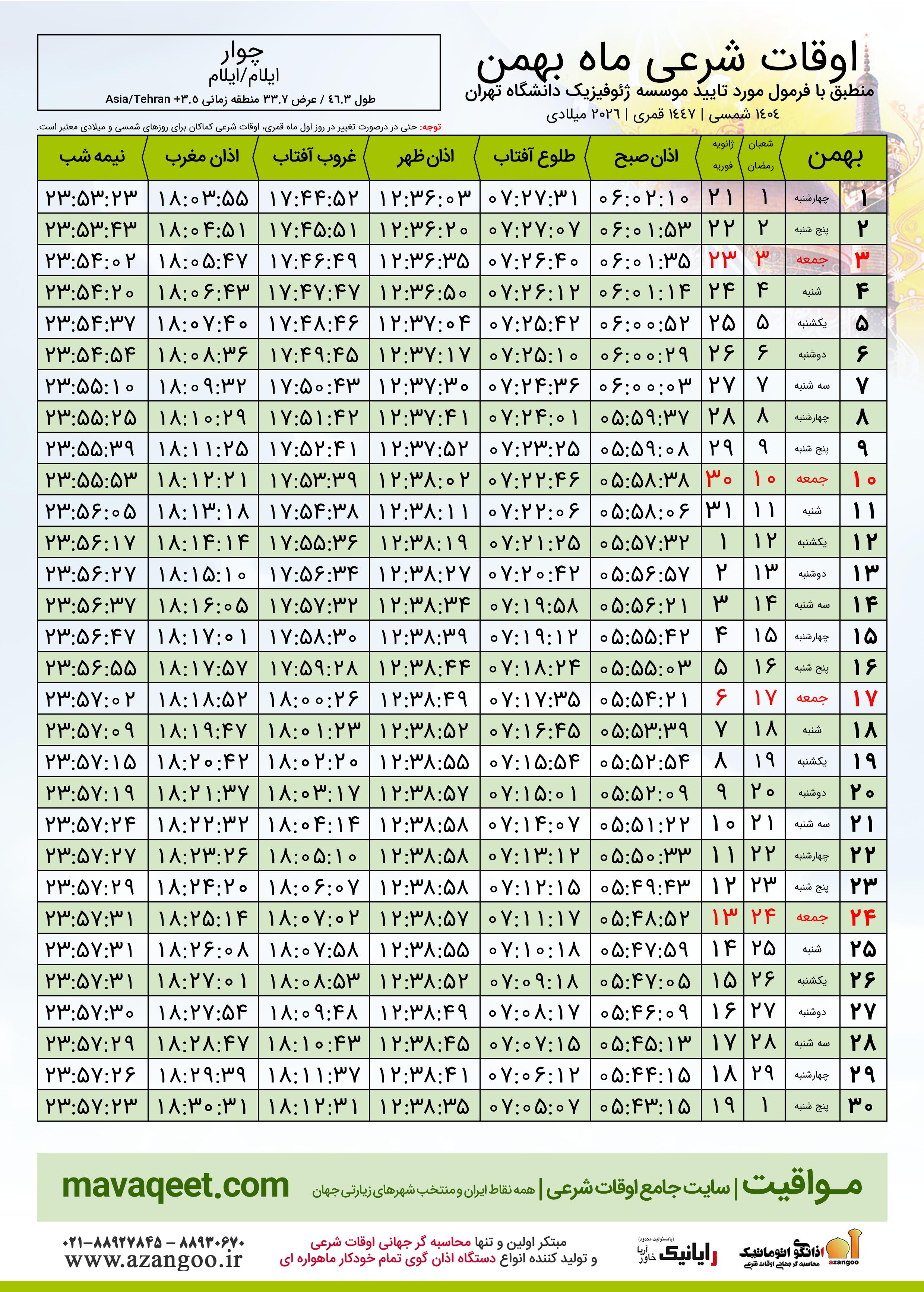 دانلود اوقات شرعی بهمن ٠٤ - ١٤٠٤ شهر چوار