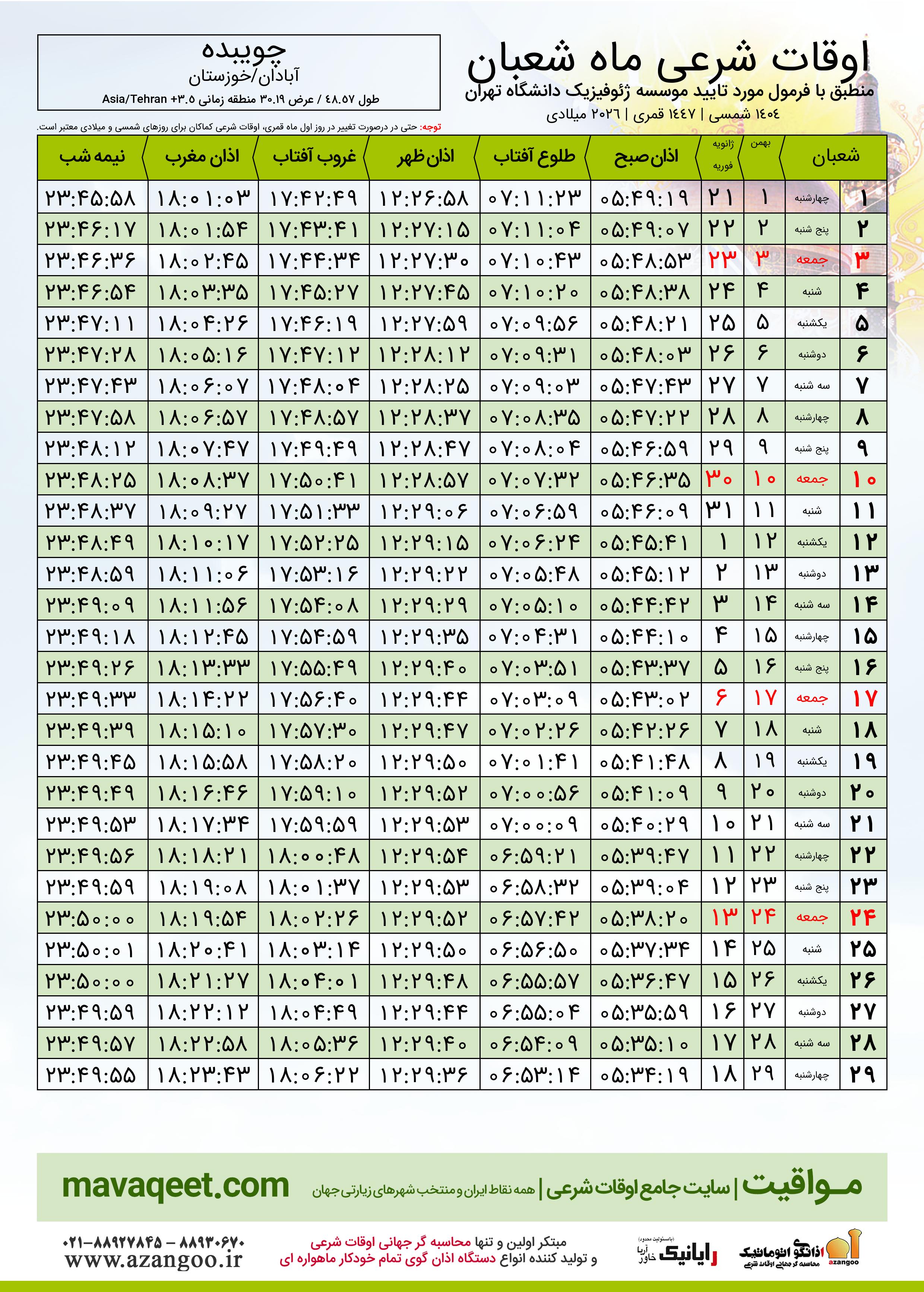 جدول اوقات شرعی شعبان ١٤٤٧ قمری شهر چویبده