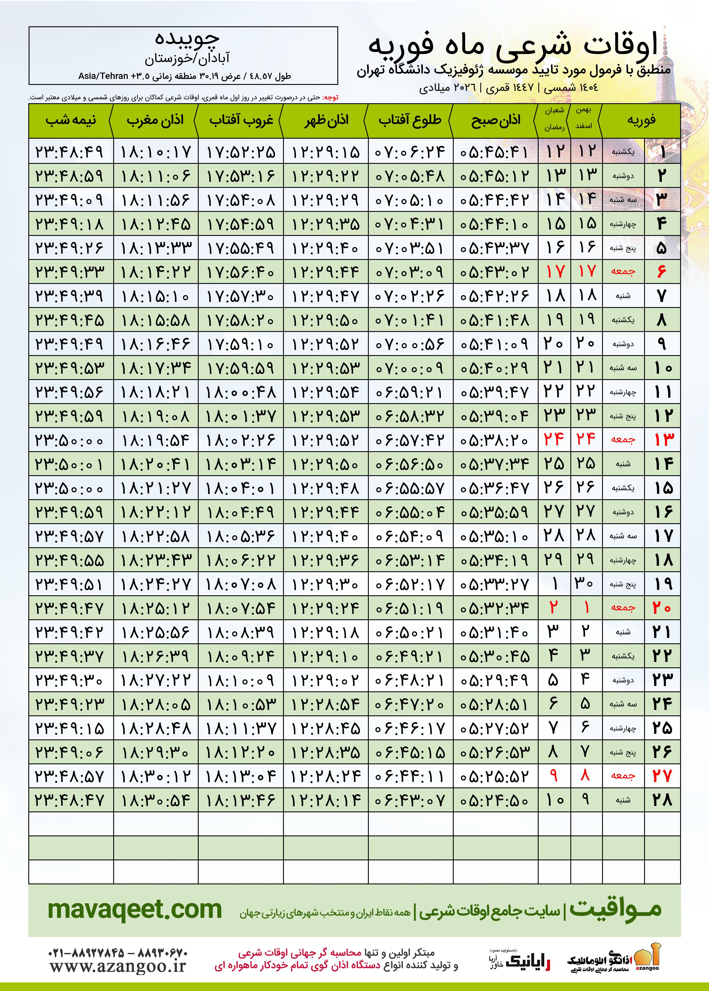 دانلود اوقات شرعی ماه رمضان ٠٤ - ١٤٠٤ شمسی | ٢٠٢٦ میلادی | ١٤٤٧ قمری شهر چویبده