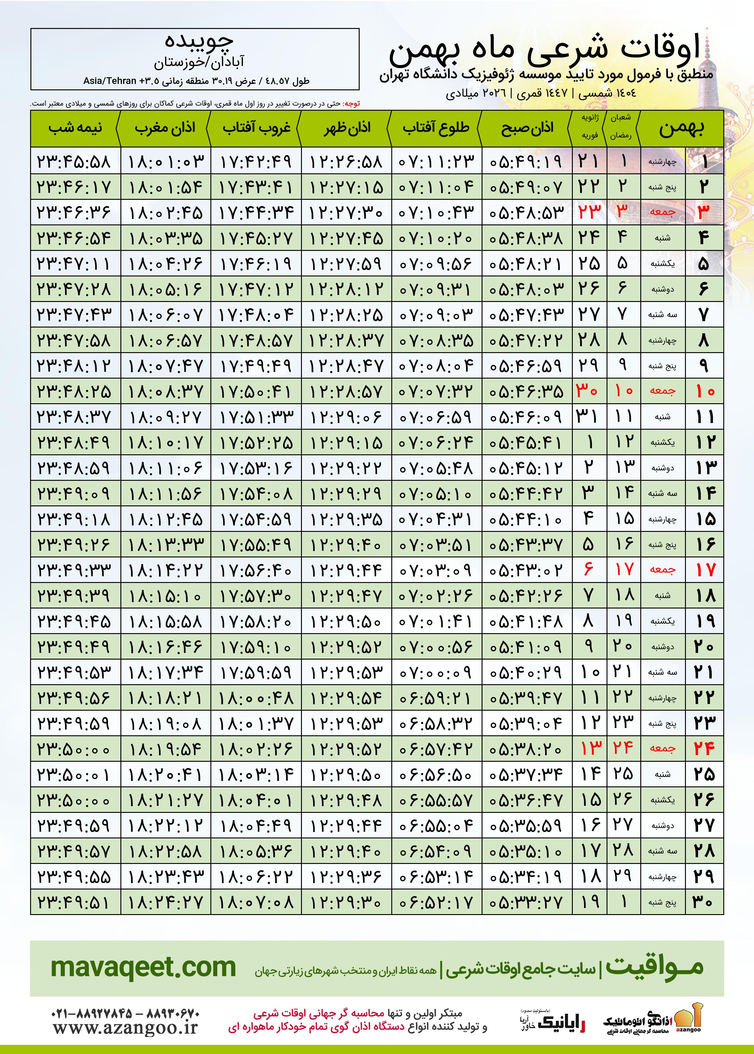 دانلود اوقات شرعی بهمن ٠٤ - ١٤٠٤ شهر چویبده