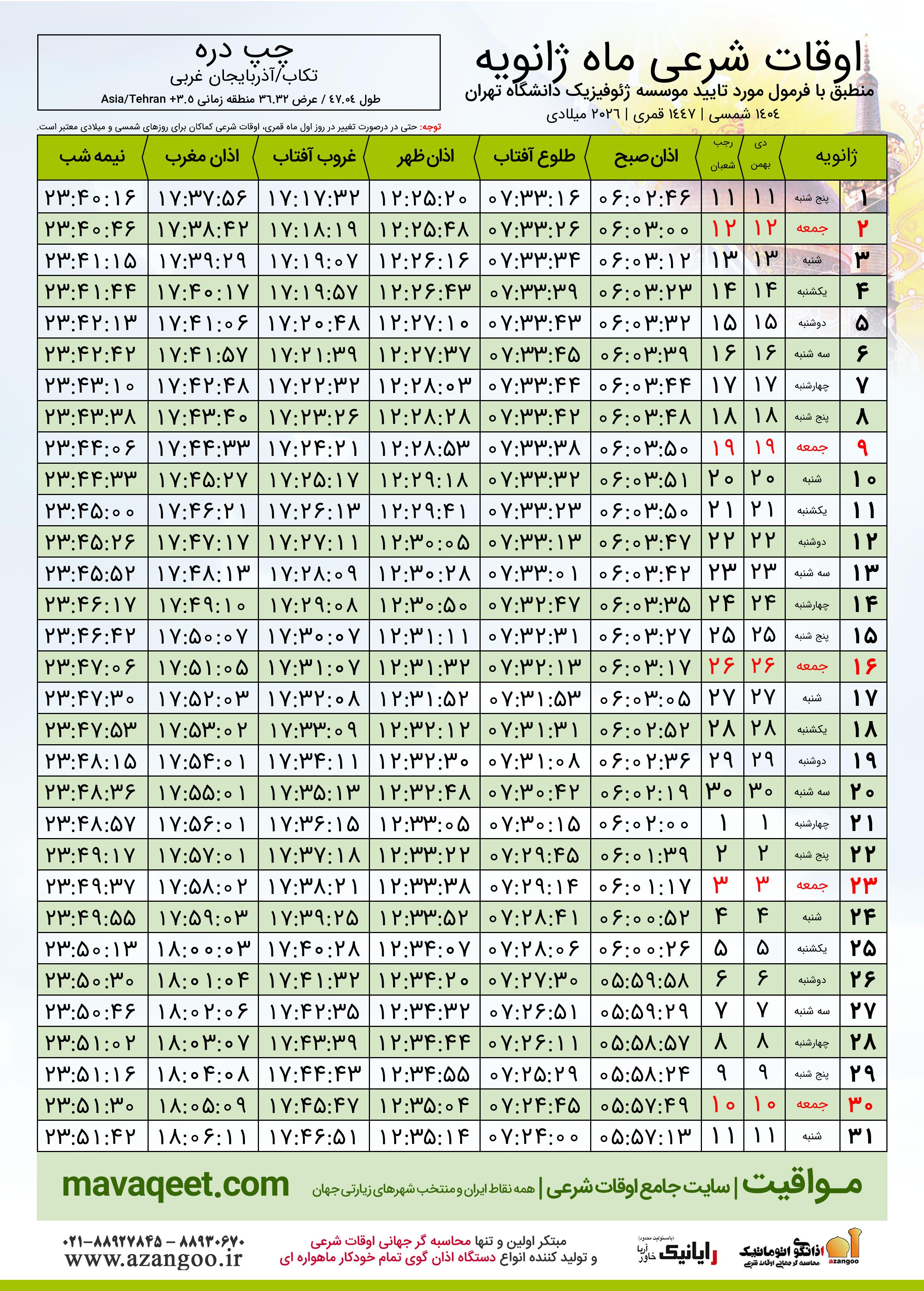 اوقات شرعی ماه شعبان ١٤٤٧ هـ.ق شهر چپ دره بر