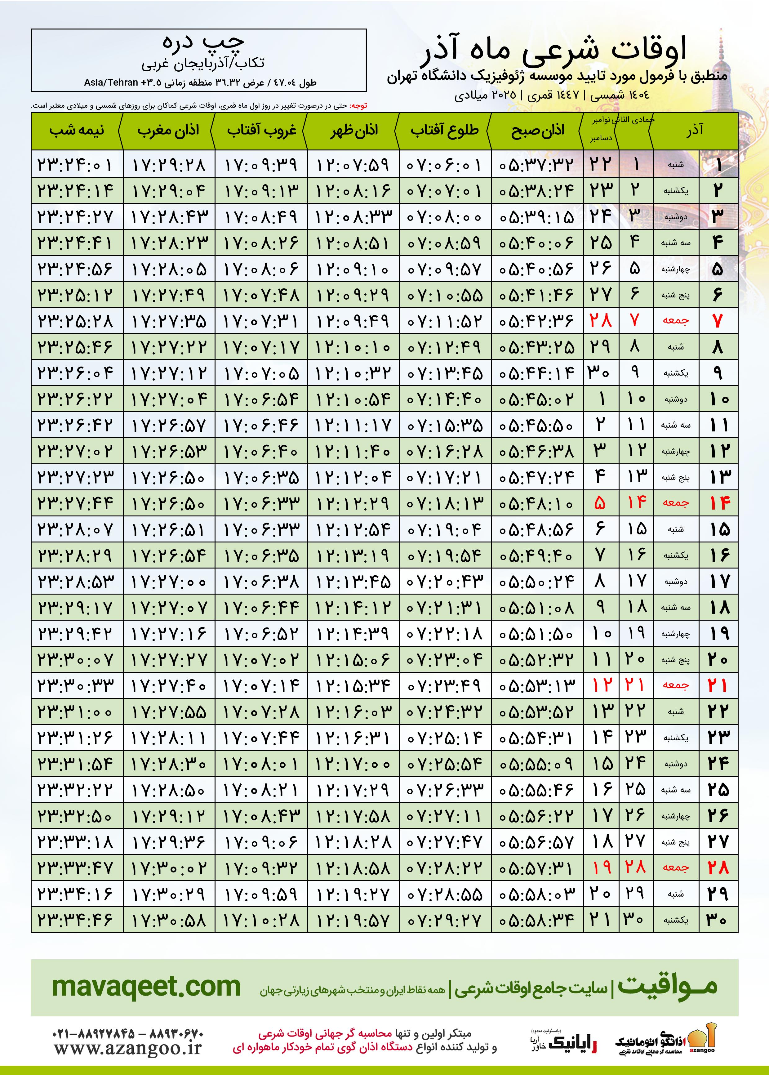جهت نمایش تصویر جدول اوقات شرعی جدول اوقات شرعی آذر ١٤٠٤ شمسی شهر چپ دره شهر چپ دره در اندازه