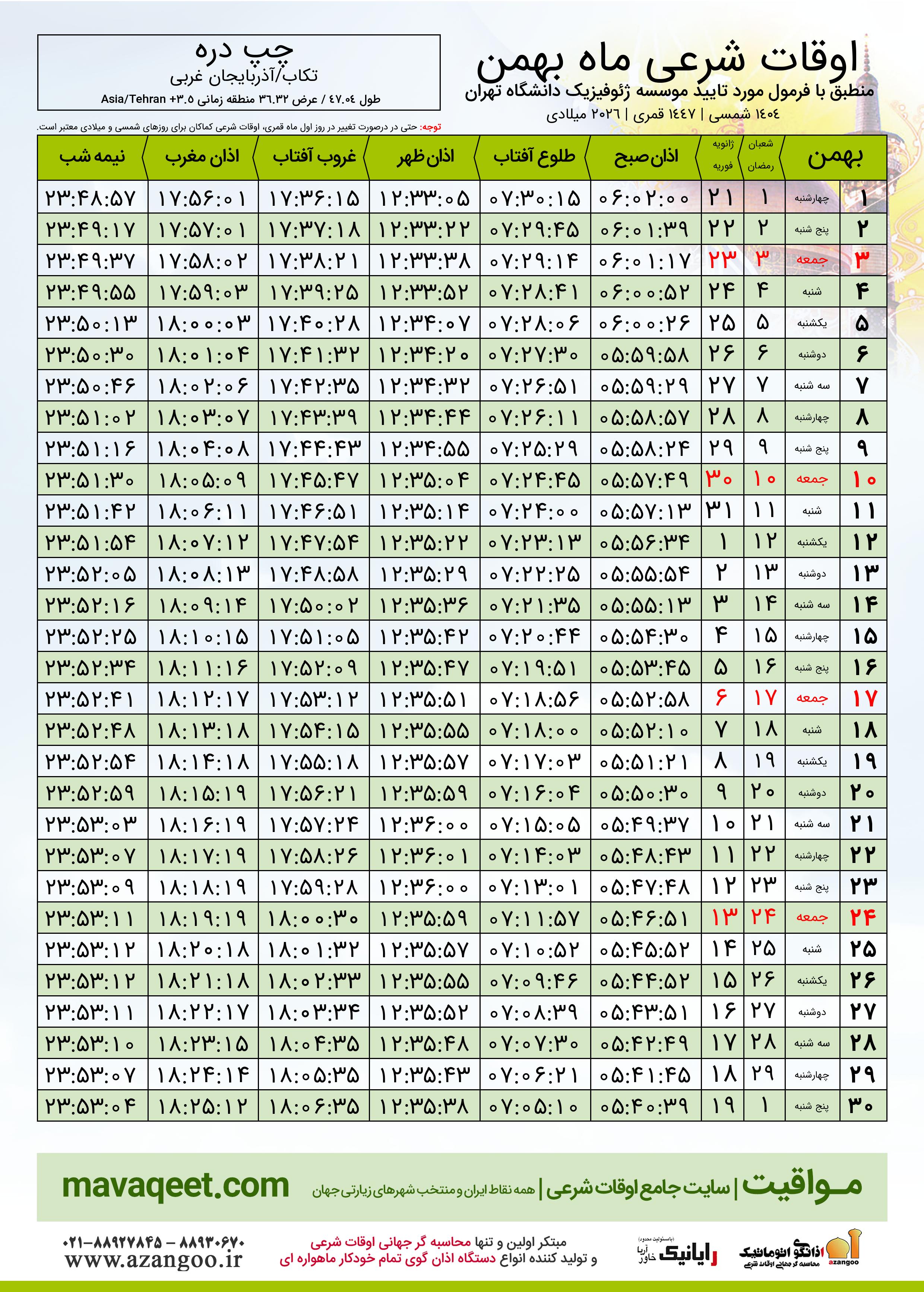 دانلود اوقات شرعی بهمن ٠٤ - ١٤٠٤ شهر چپ دره