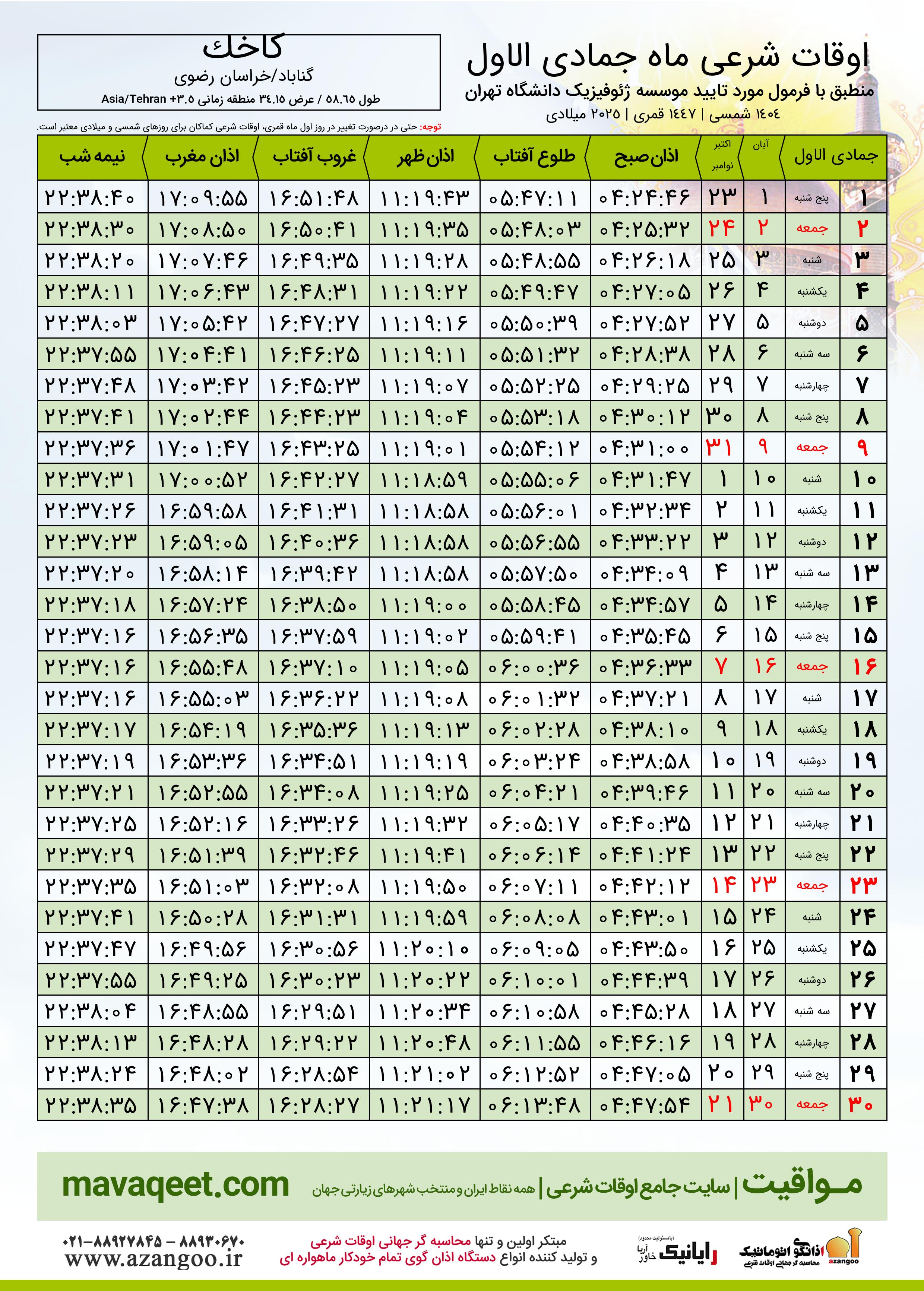 جدول اوقات شرعی جمادی الاول ١٤٤٧ قمری شهر کاخک