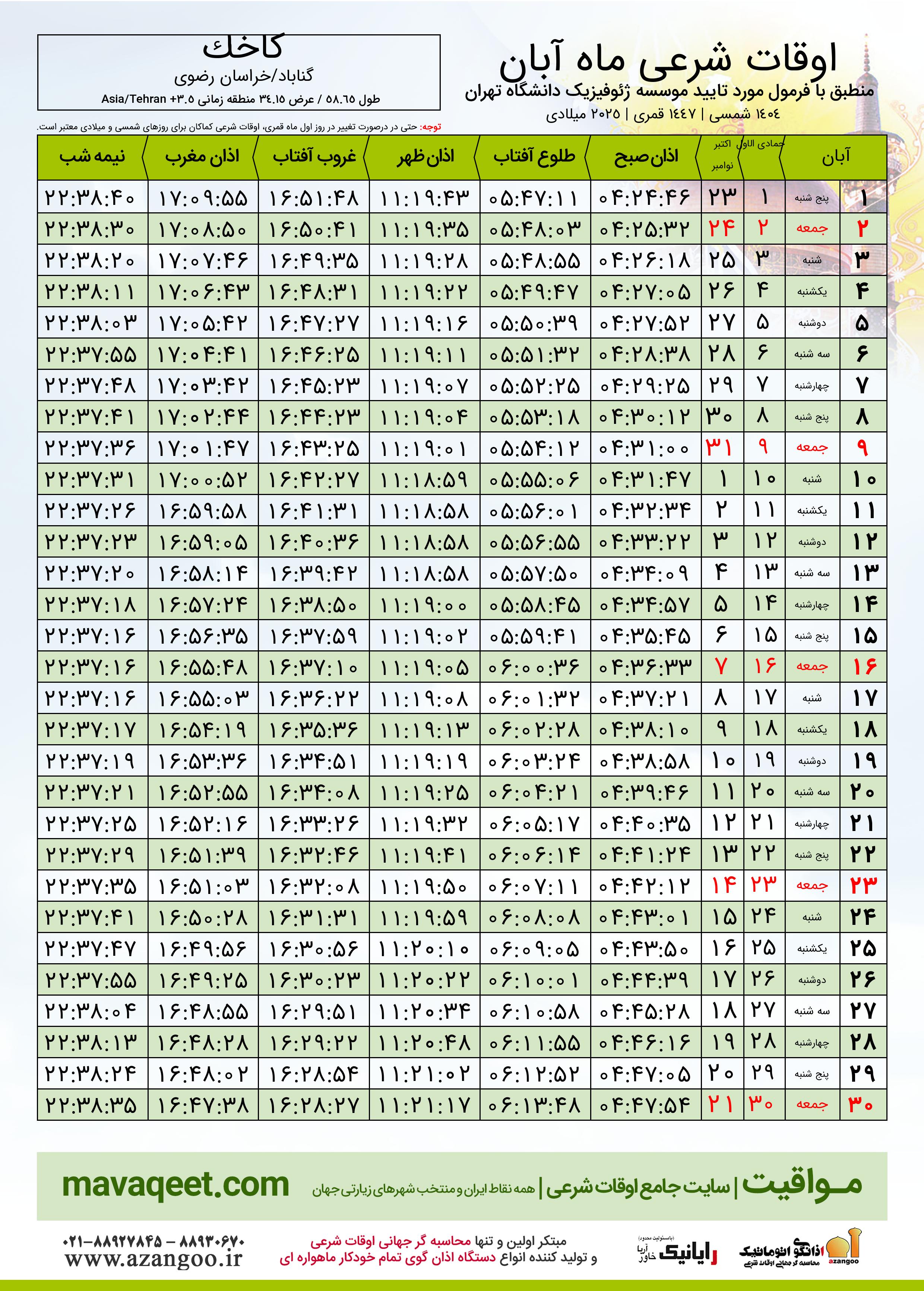 جدول اوقات شرعی آبان ١٤٠٤ شمسی شهر کاخک