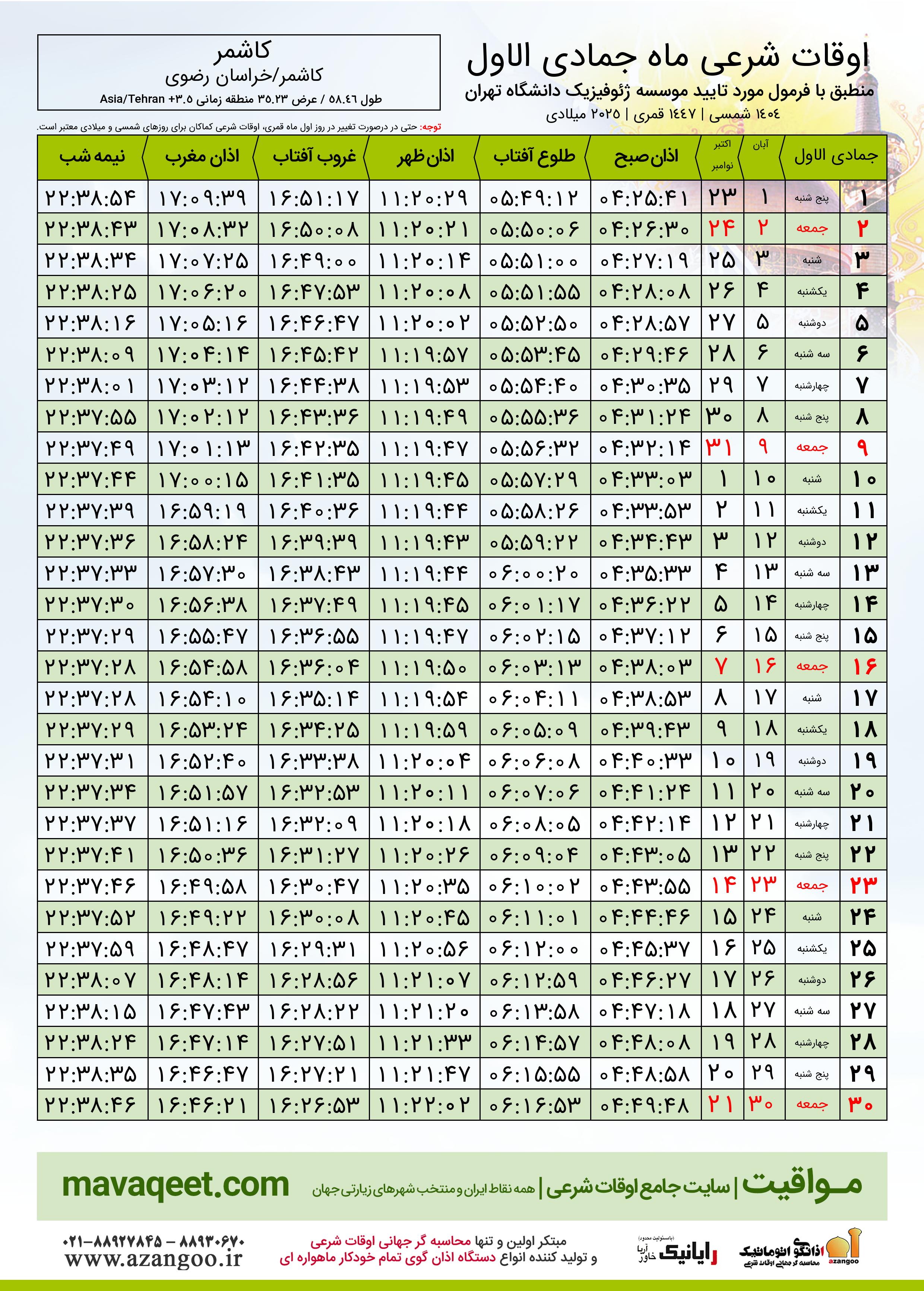 جدول اوقات شرعی جمادی الاول ١٤٤٧ قمری شهر کاشمر