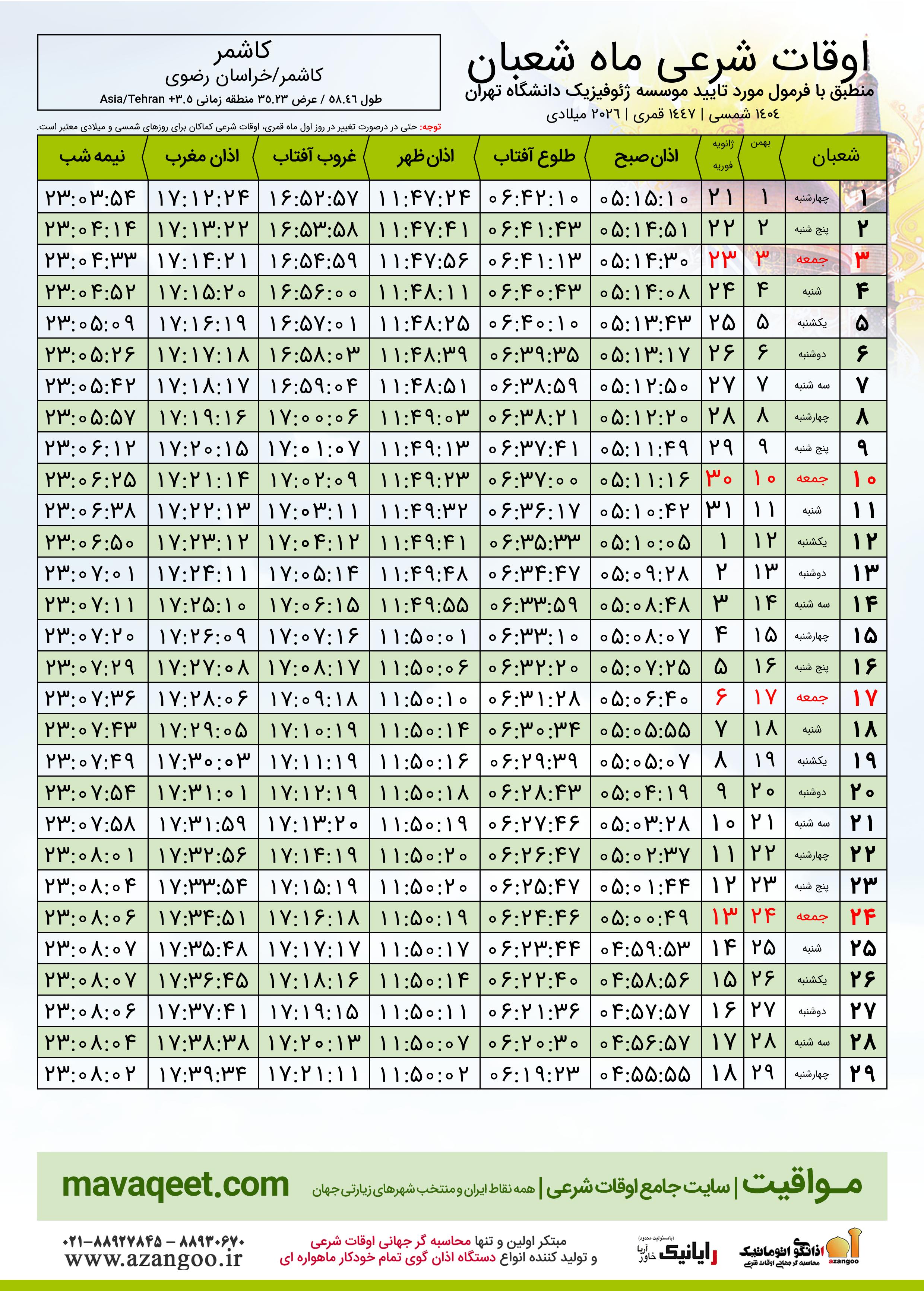 اوقات شرعی ماه شعبان ١٤٤٧ هـ.ق شهر کاشمر بر