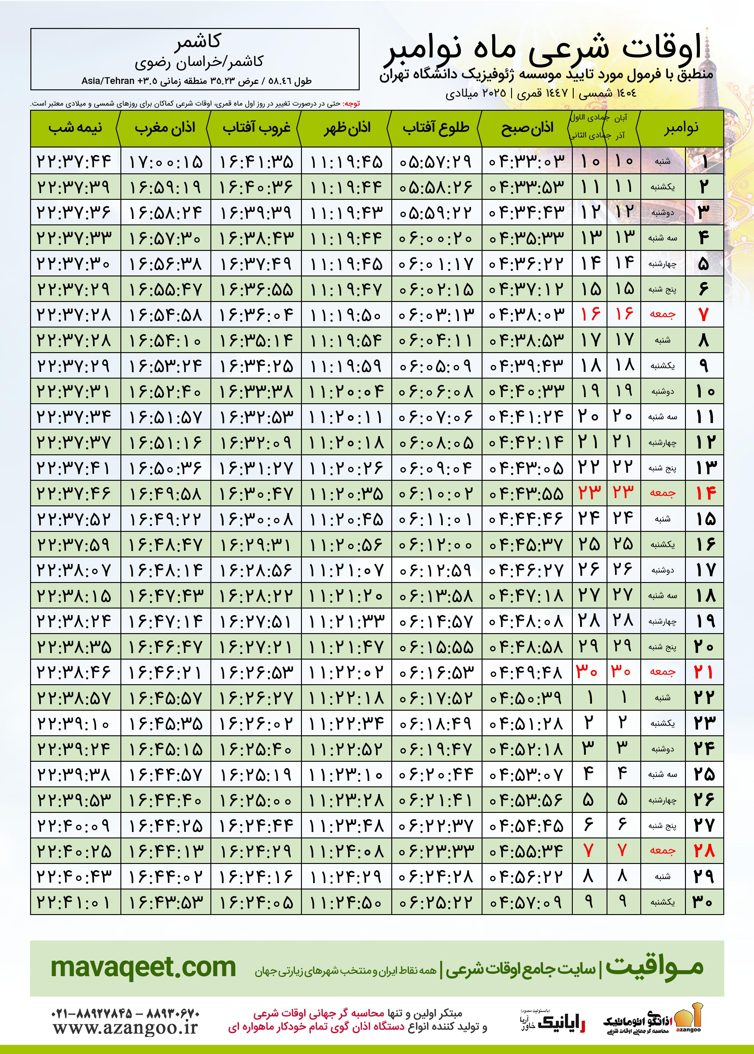 جدول اوقات شرعی نوامبر ٢٠٢٥ میلادی شهر کاشمر