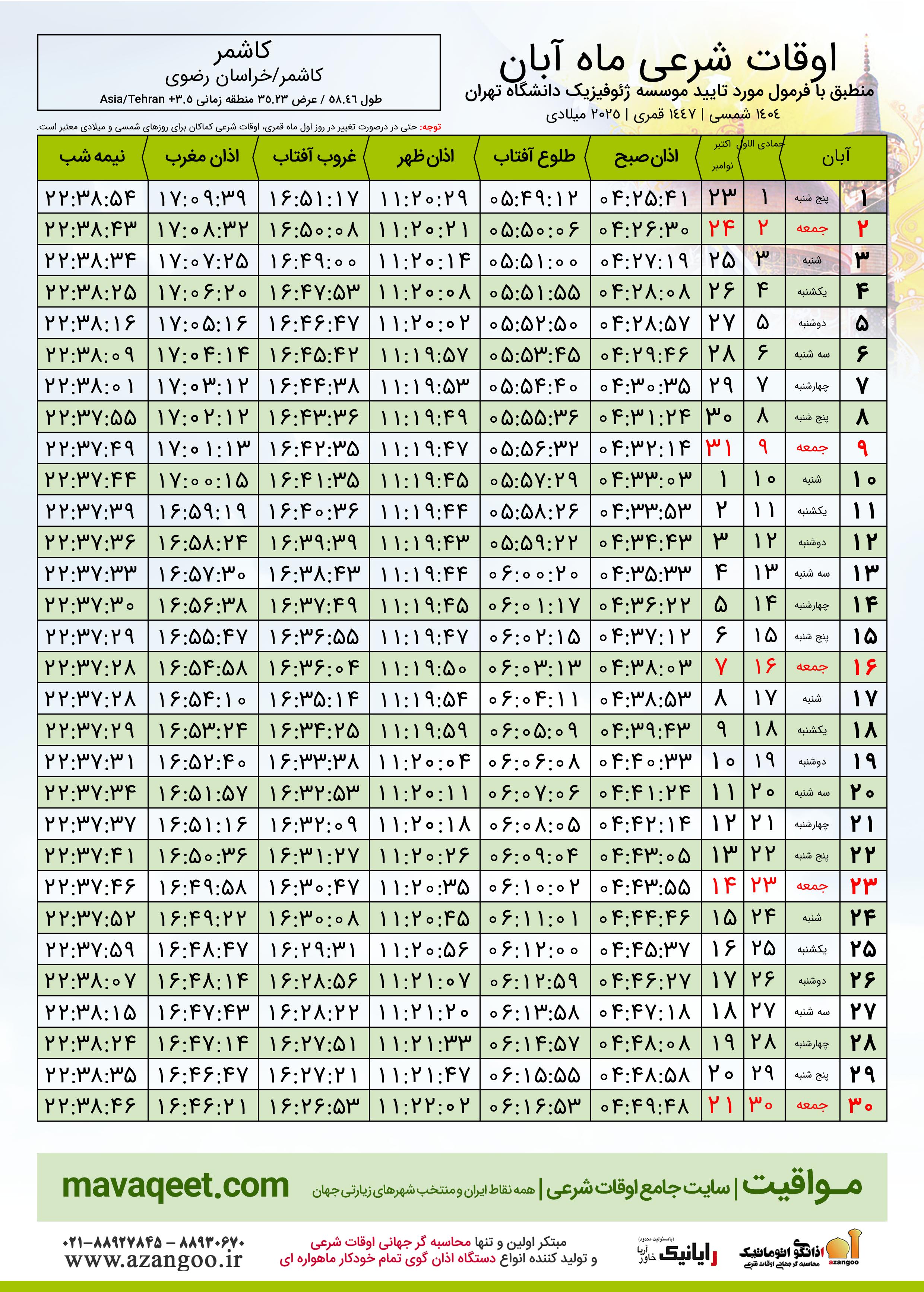 جدول اوقات شرعی آبان ١٤٠٤ شمسی شهر کاشمر