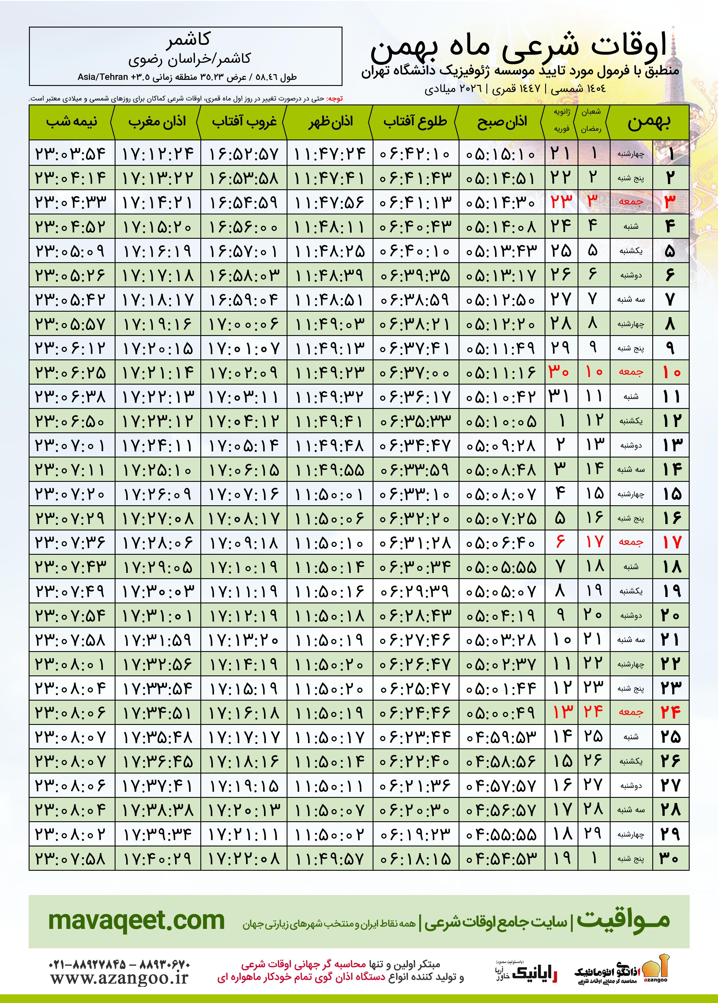 دانلود اوقات شرعی بهمن ٠٤ - ١٤٠٤ شهر کاشمر