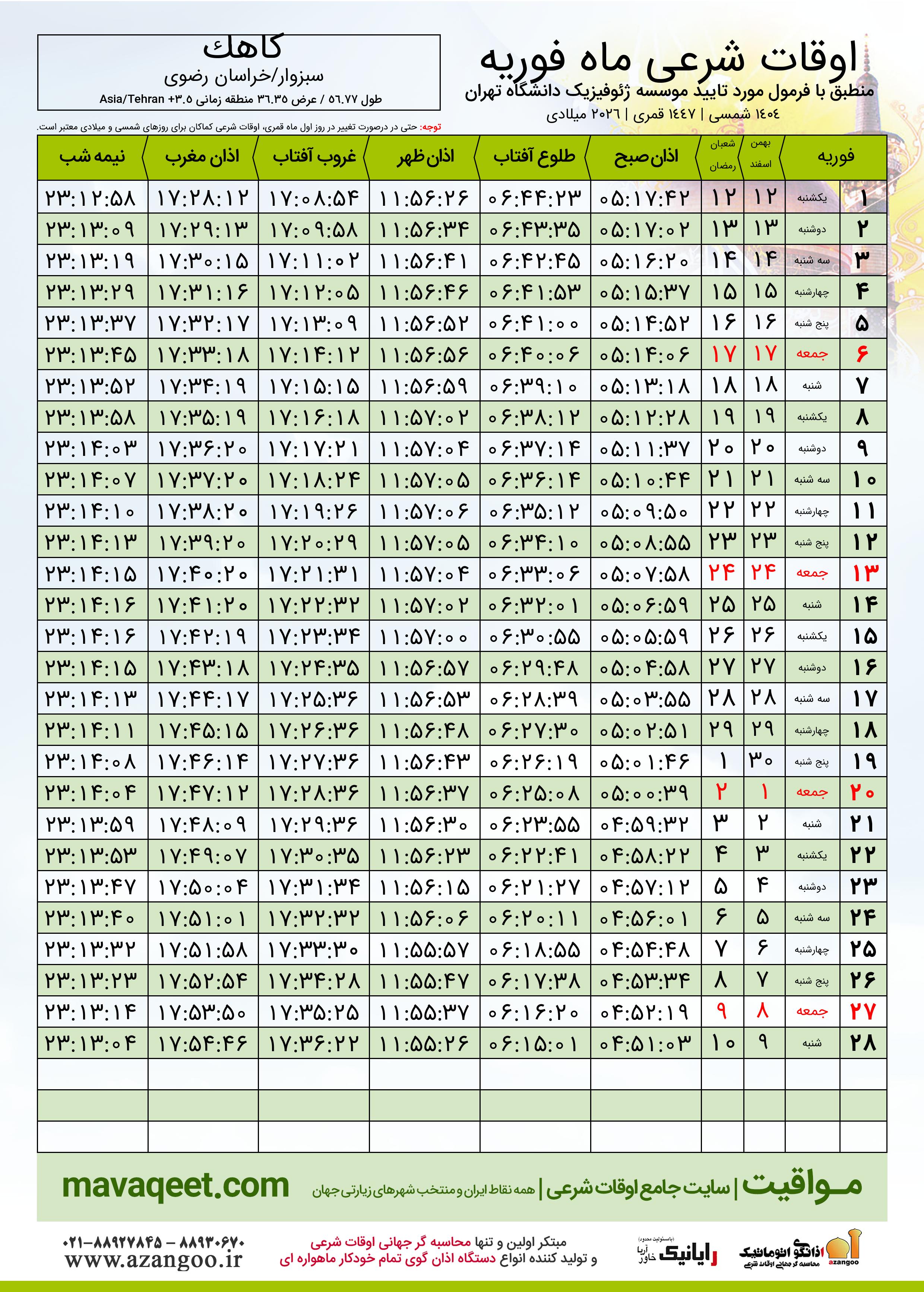 اوقات شرعی فوریه ٢٠٢٦ میلادی شهر کاهک