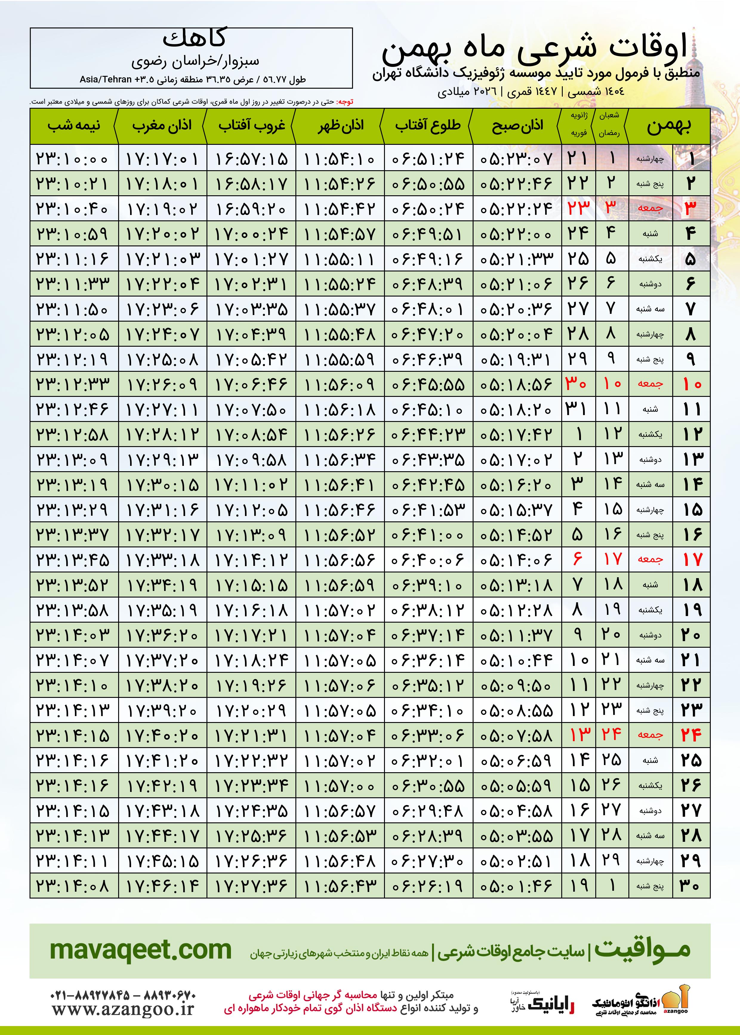 اوقات شرعی بهمن ١٤٠٤ شمسی شهر کاهک