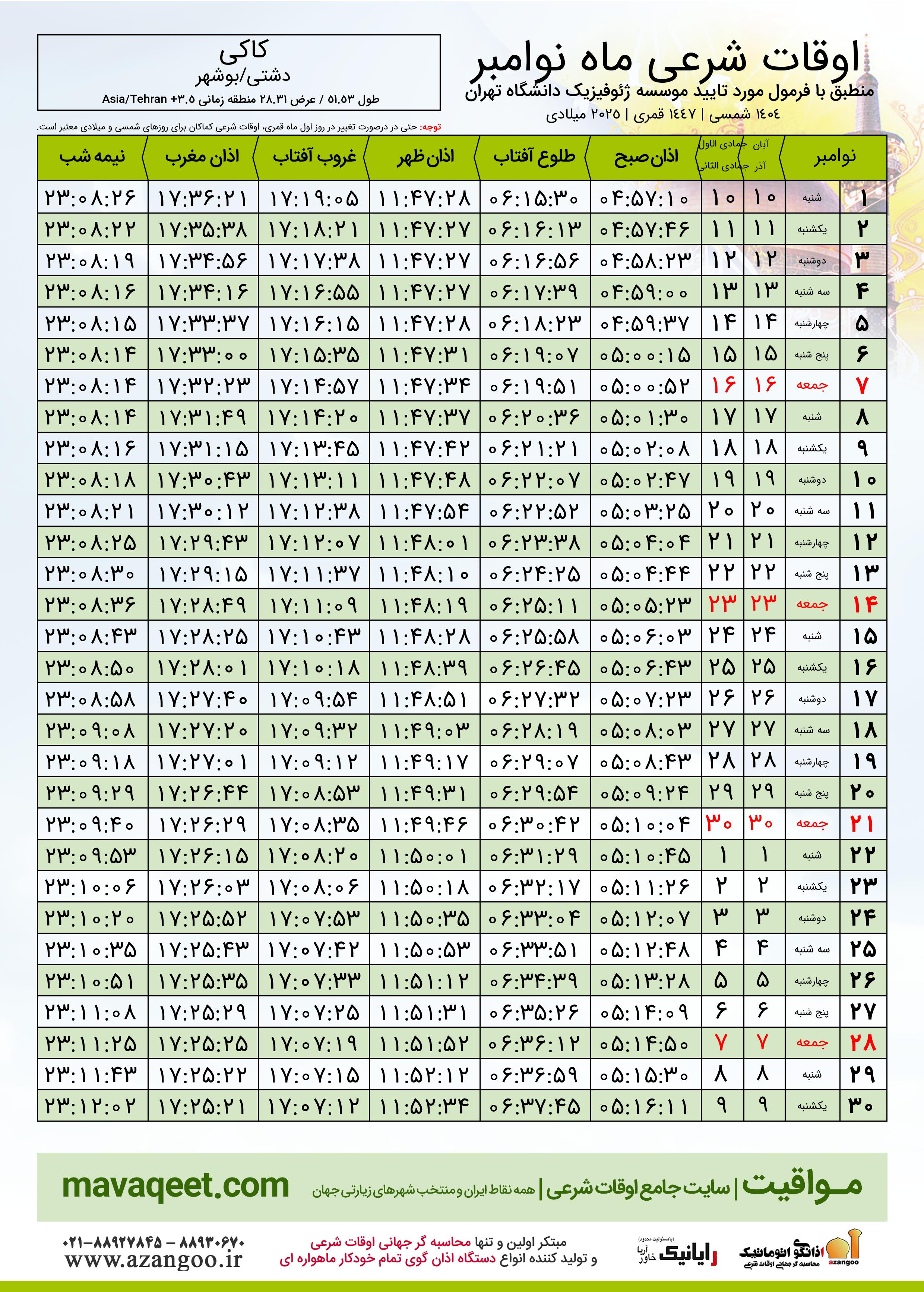 دانلود اوقات شرعی نوامبر ٢٠٢٥ شهر کاکی