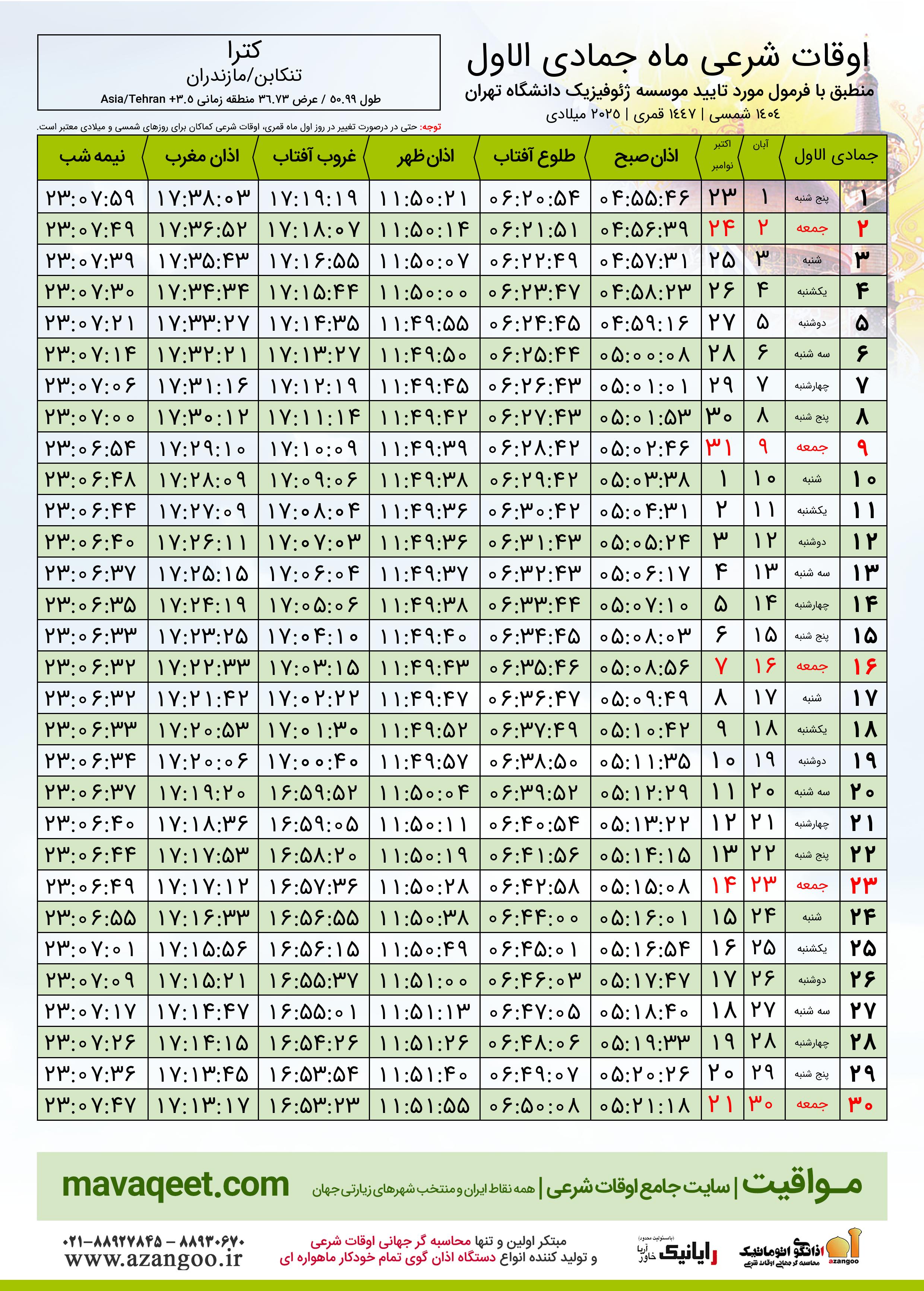 اوقات شرعی ماه جمادی الاول ١٤٤٧ هـ.ق شهر کترا بر