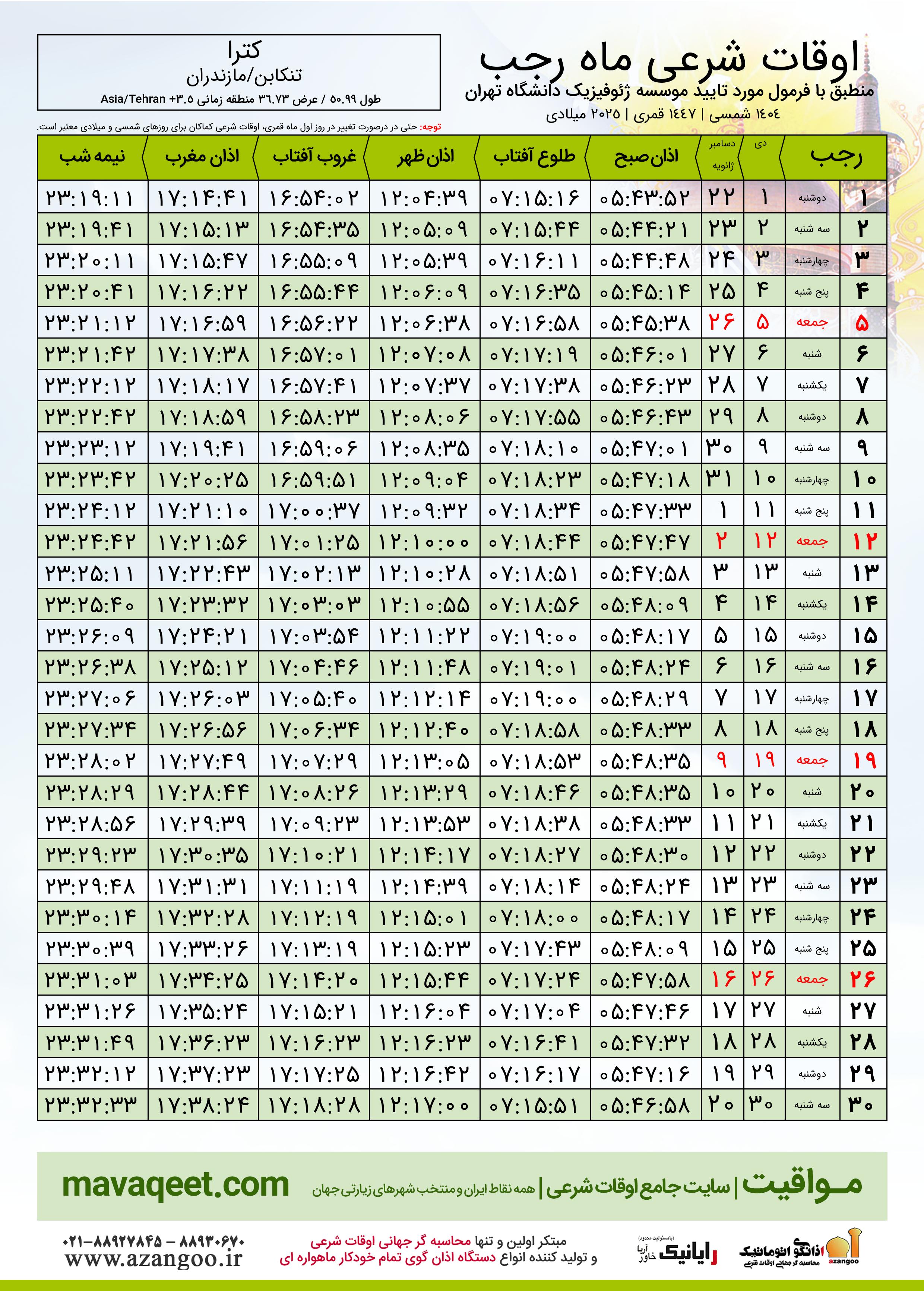 اوقات شرعی ماه رجب ١٤٤٧ هـ.ق شهر کترا بر