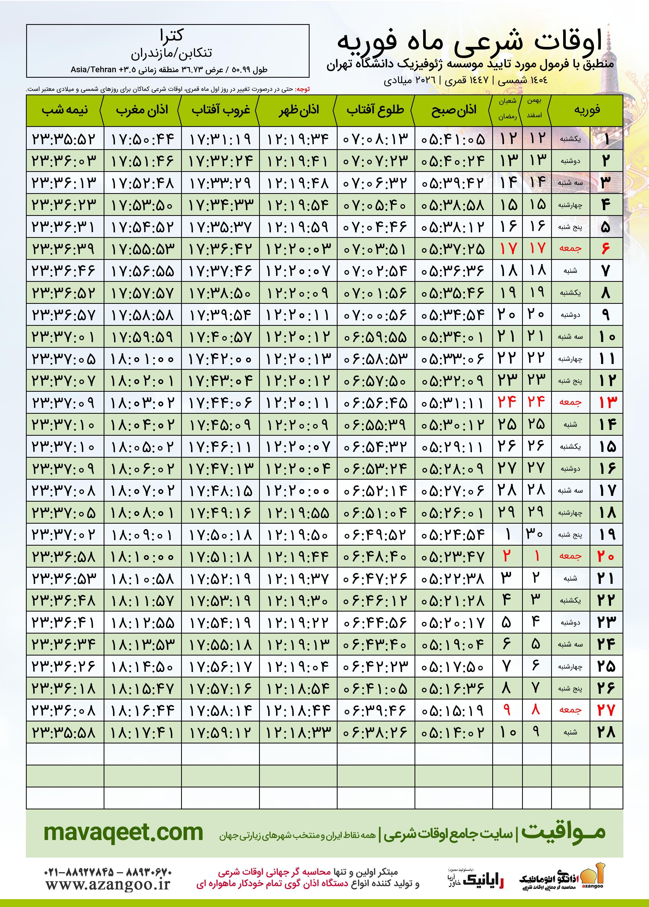 جدول اوقات شرعی ماه رمضان شهر کترا ٠٤ - ١٤٠٤ شمسی | ٢٠٢٦ میلادی | ١٤٤٧ قمری